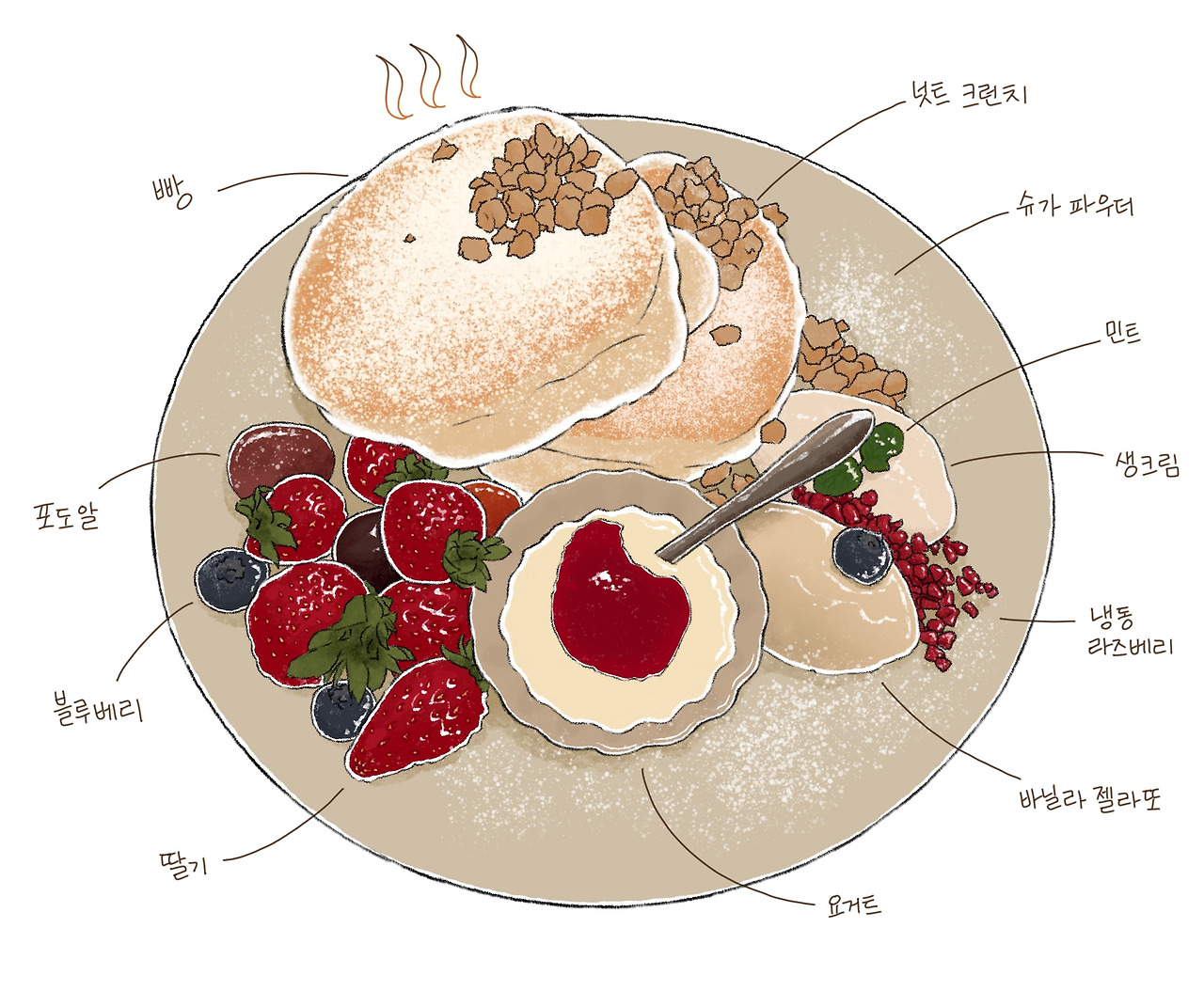 디저트는 일단 눈으로 먹는다고 했지. 화사하다는 표현으론 한참 모자라고 적절한 형용사를 찾다보니 디지털 세대인 나의 단어로는 풀칼라를 너머 4K 그것도 모자라 8K로 묘사해야 할 팬케잌이었다.
