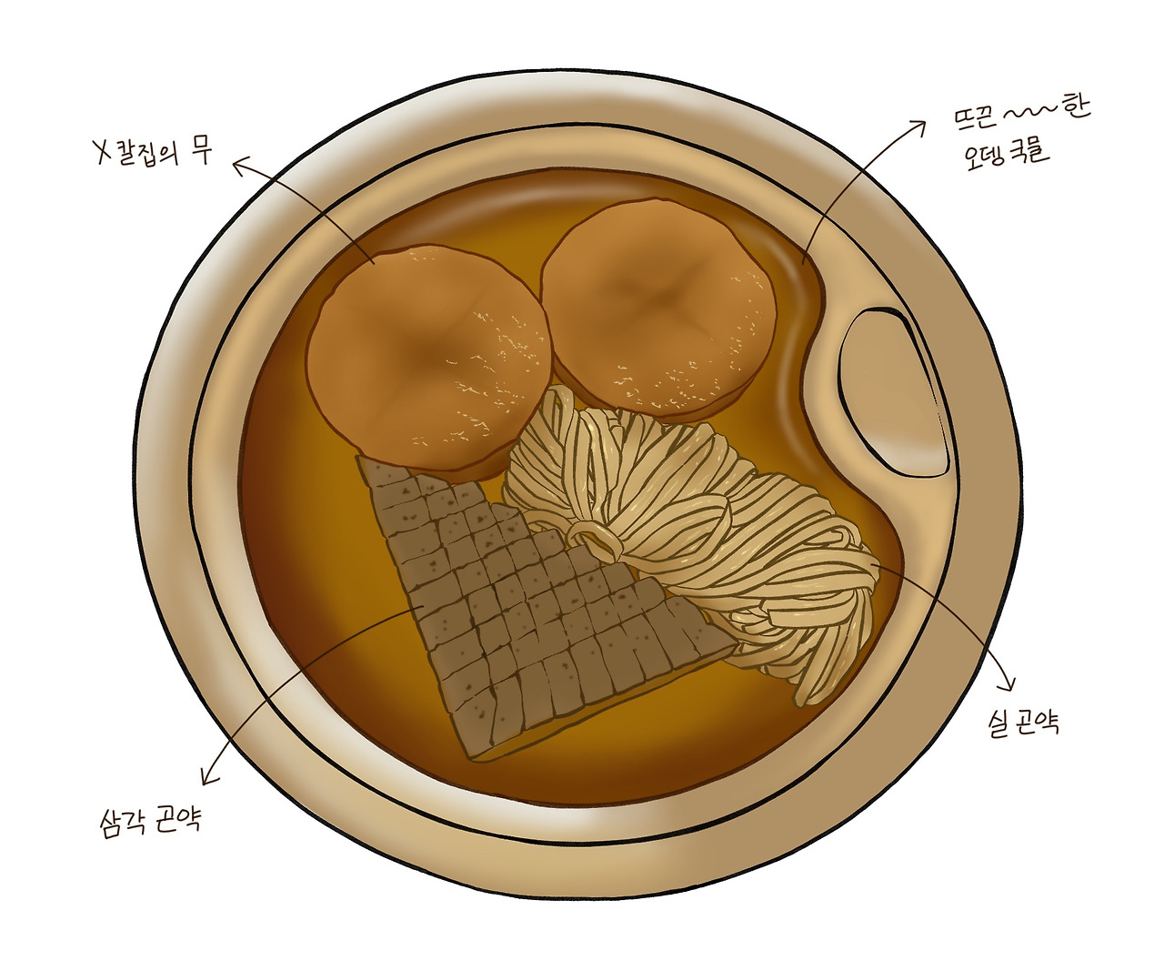 "곤약 하나, 실곤약 하나. 또 무 하나랑... 마지막으로 계란 하나요. 국물 많이 주세요."
