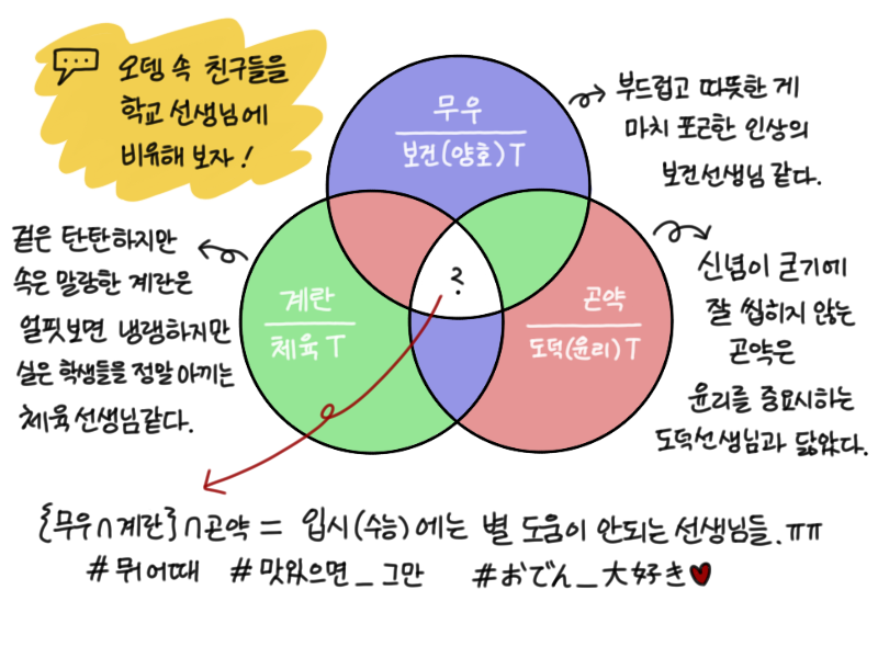 오뎅을 담을때 언제나 곁에 두는 이 세 친구(곤약, 계란, 무우)들과 매칭과는 선생님들의 공통점은 무엇? 그 교집합은 매정하게도 입시에 별 도움 안되는 교과라는 것이다. ㅠㅠ