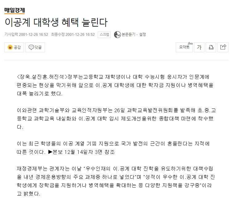 어찌 되었던 "이공계 기피 현상"은 상대적으로 사라지고 "문송합니다."라는 신조어가 현실을 대변하고 있다.
