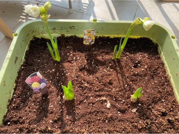 수선화는 세 개, 히야신스는 하나가 왔다. 벌써 꽃봉우리가 맺어있어 수선화는 금방 필 것 같다. 향이 궁금해서 코를 대보니 인조향 느낌. 내가 생각했던 향긋함이 아니다. 무슨 비누냄새 같았다고나 할까? 그래도 노란 꽃이 피면 예쁘겠다 싶었다. 겨우내 방치되었던 흙들을 손보고 물을 촉촉히 준 다음 구근들을 심었다. 고작 4송이지만 꽃만 펴 준다면 제대로 봄단장 한 기분이다.