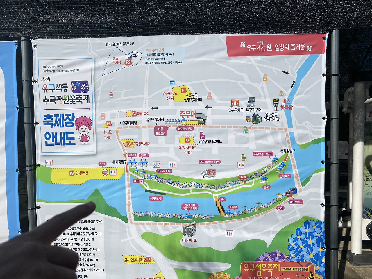 유구라는 곳이 읍이라고 한다. 그래서 맨 앞에 유구가 붙었고, 색동이라는 건 수국의 다양한 색을 이야기하는 듯 하다. 축제답게 가수도 오고 야장도 있고. 북적북적했다. 하지만 역시나 주차장은..
