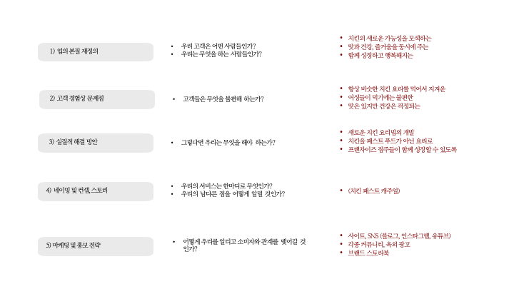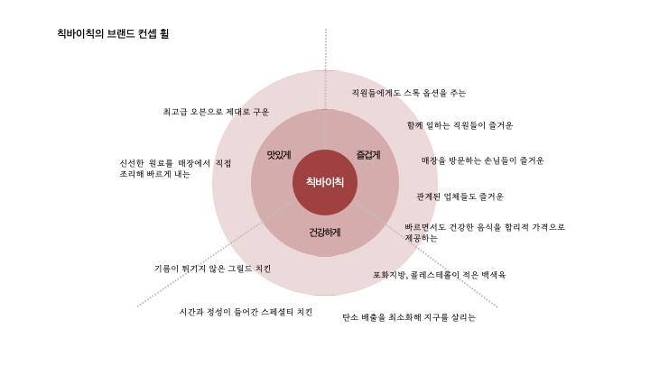 위에서 고민한 내용들을 브랜드 컨셉 휠로 옮겨 적어 보았다. 핵심 가치를 찾는 것도 중요하지만 이를 구체화하는 것은 더욱 중요하다. 우선 맛과 건강, 즐거움이라는 세 가지 키워드를 삼등분한 원에 배치한다. 그 다음 칙바이칙만의 차별화된 '맛'은 어디서 오는지, 이 맛을 강화하기 위해 무엇을 해야 하는지를 구체화해 간다. 건강과 즐거움에 관한 정의도 마찬가지다. 이 목록을 추가하고, 실천하고, 직원은 물론 가맹점주, 나아가 소비자들까지 이러한 변화를 피부로 느낄 수 있을 때 하나의 브랜드가 완성되는 것이다.