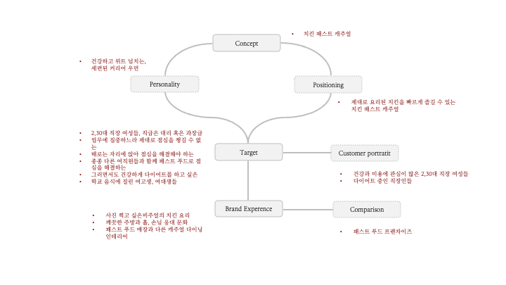 이제 핵심 가치와 차별화 요소는 명확해졌다. 마지막으로 할 일은 브랜드 컨셉을 중심으로 브랜드 포트폴리오를 완성하는 일이다. 칙바이칙의 컨셉은 '치킨 패스트 캐주얼'이다. 패스트 푸드의 장점인 속도와 편리함에 더해, 캐주얼 다이닝 식당에서 경험할 수 있는 제대로 된 요리를 제공하는게 핵심이다. 그 다음으로 타겟을 구체화하고 어떻게 이 브랜드를 경험할 수 있는지에 대해서도 다시 정리했다. 이 한 장으로 모든 브랜드 구성원들이 브랜드의 핵심 요소를 분명히 파악하 수 있도록 하는 것이 그 목적이다.