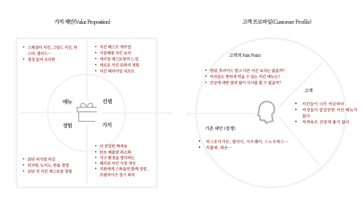 그 다음으로 칙바이칙의 '가치 제안 캔버스'를 함께 그려 보았다. 기존 치킨 시장의 메뉴들은 한결같이 비슷하다. 경쟁은 치열하지만 메뉴는 엇비슷하다. '푸라닭'이 사람들에게 사랑을 받고 있는 것도 그 지루한 경쟁에 작은 균열을 냈기 때문이다. 가치 제안 캔버스를 통해 고객과 고객의 Pain Point를 간단하게 다시 정리했다. 이 캔버스가 필요한 이유는 고객의 프로파일을 기본으로 차별화된 가치 제안을 '시각화' 해주기 때문이다. 메뉴와 컨셉, 경험, 가치 등에서 칙바이칙이 차별화할 수 있는 요소들을 다음가 같이 정리해보았다.