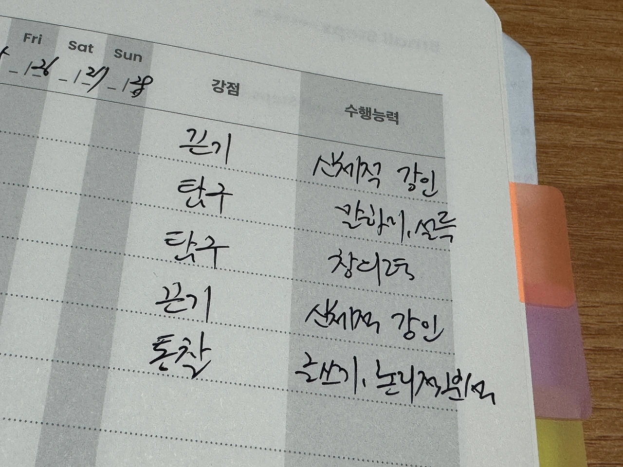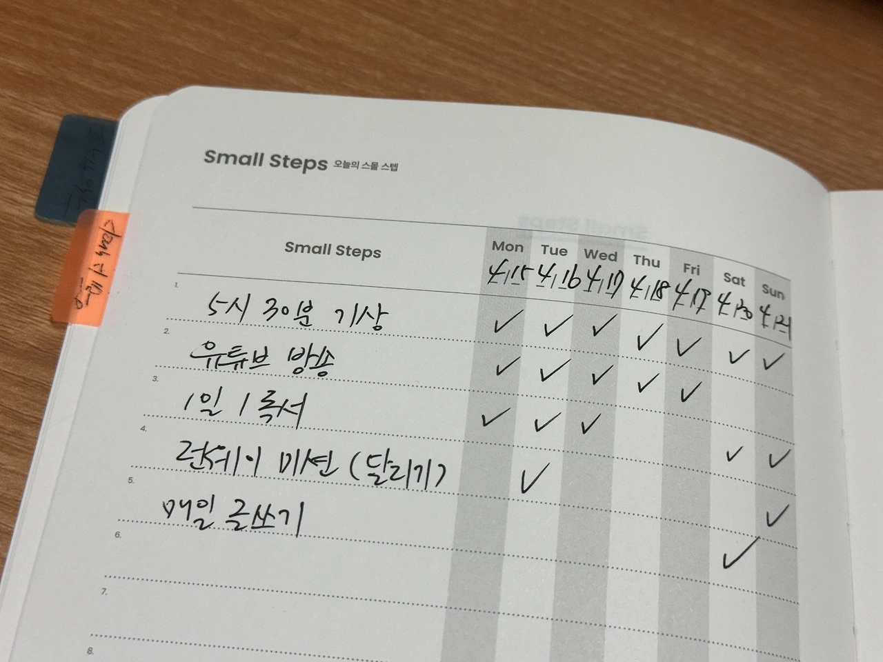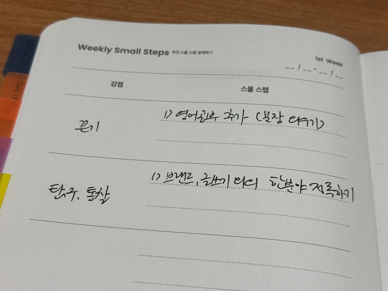 이렇게 나의 강점에 대해 알게 되면 이를 강화하기 위한 스몰 스텝을 추가할 수 있다. 나의 경우 끈기와 탐구에 강점이 있으므로 이에 관련된 스몰 스텝을 추가했다. 끈기에 기반해 새롭게 영어 문장 외우기를 추가하기로 했고 탐구와 통찰을 강화하기 위해 기존의 글쓰기와 브랜드 외에 전문적인 독서를 시작하기로 했다.
