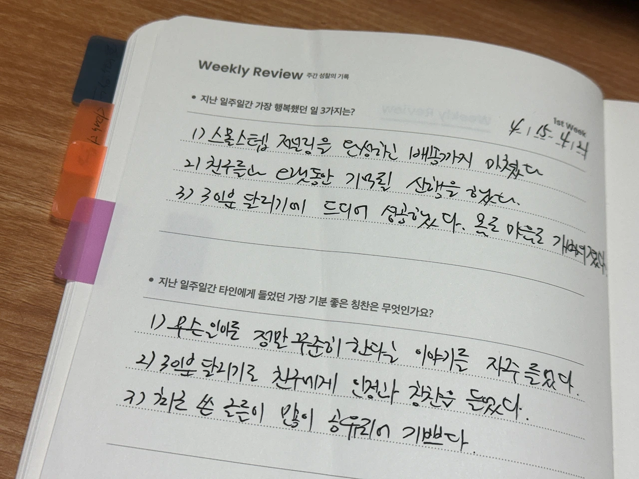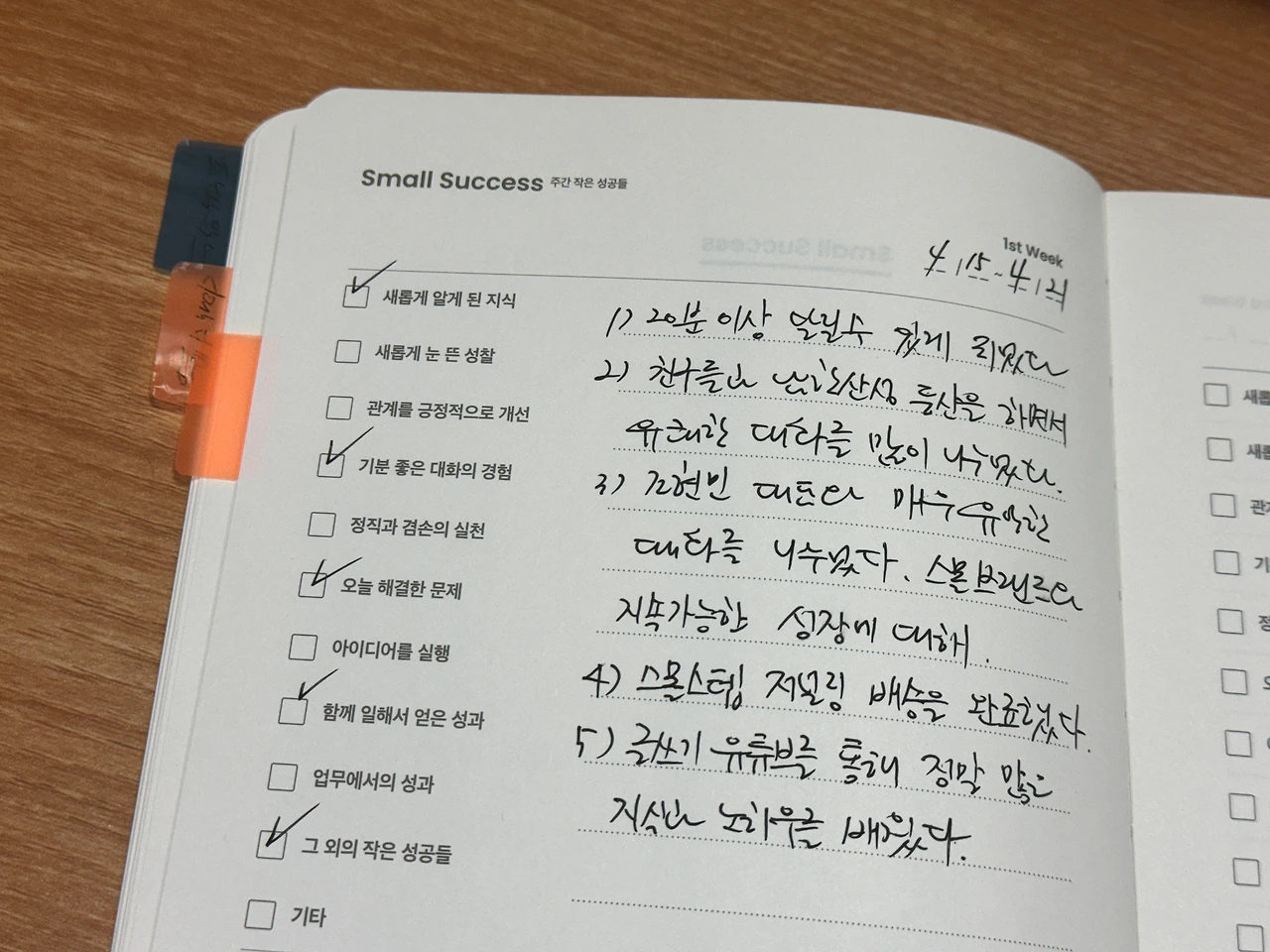 '스몰 석세스'는 일주일 간 내가 성취해낸 작은 성공들을 기록하는 챕터다. 사실 이 경우 무얼 써야할지 막연하기 마련인데 스몰 스텝 저널링은 그 항목들을 구체적으로 가이드하고 있다. 기분 좋은 대화나 새롭게 눈 뜬 성찰, 업무에서의 작은 성공들을 기록하는 과정을 통해 자연스럽게 나에 대한 이해와 강점 발견이 가능하다.