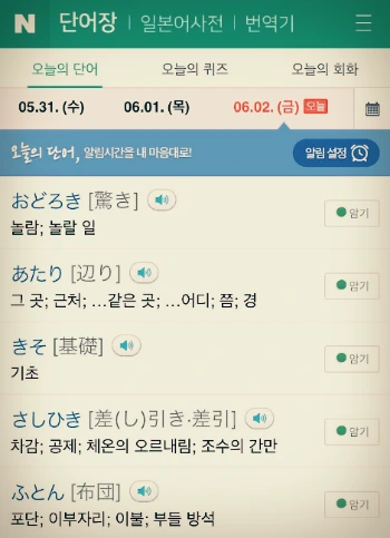 포털 사이트가 매일 제공하는 일어 단어 다섯 개를 무조건 외우는 방법이다.