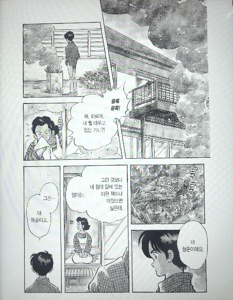 '엄마는 아무 일 없는 듯 가볍게 문을 닫았다. 매캐한 연기 때문인지 눈물이 한 방울 흘러내렸다. 엄마는 손등으로 무심히 눈물을 닦아내며 방금 전 보았던 아들의 어깨를 떠올렸다. 가볍게 떨리고 있었다. 히로의 엄마는 소리없는 아들의 흐느낌을 폭포수 소리처럼 크게 들을 수있었다.'