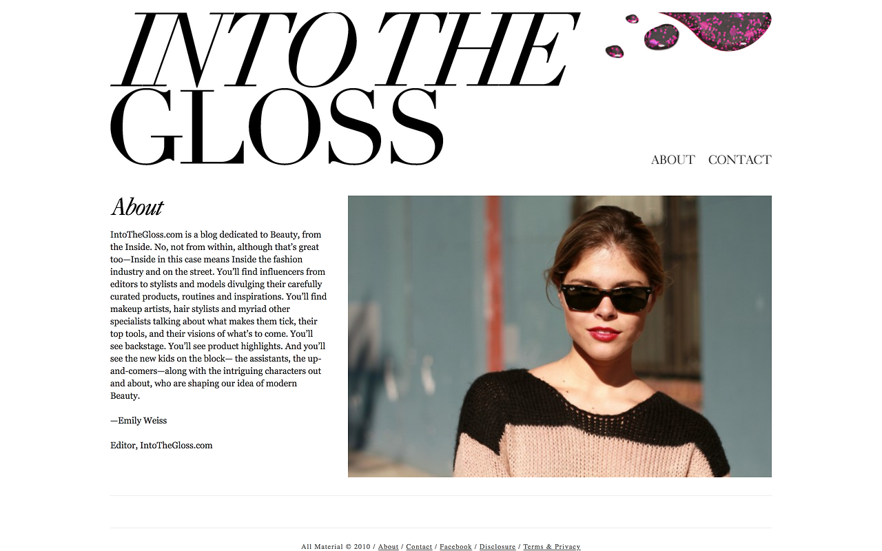 '인투 더 글로스(Into the Gloss)'라는 뷰티 블로그가 있었다. 블로그의 주인의 이름은 에밀리 와이즈(Emily Weiss), 보그(VOGUE) 매거진에서 패션 스타일리스트의 어시스턴트로 일하는 평범한 직장인이었다. 그녀는 직업상 수많은 셀럽을 만나고 다녔다. 그리고 한 가지 사실을 발견한다. 명품 옷이나 액세서리와는 달리 적어도 화장품 만큼은 패션모델과 평범한 사람들이 쓰는 제품이 동일한 경우가 많다는 사실이었다. 그녀는 이 사실에 초점을 맞추어 화장품 그 자체가 아닌, 화장품을 쓰는 사람들에 초점을 맞춘 뷰티 블로그를 개설한다. 2010년 가을의 일이었다.