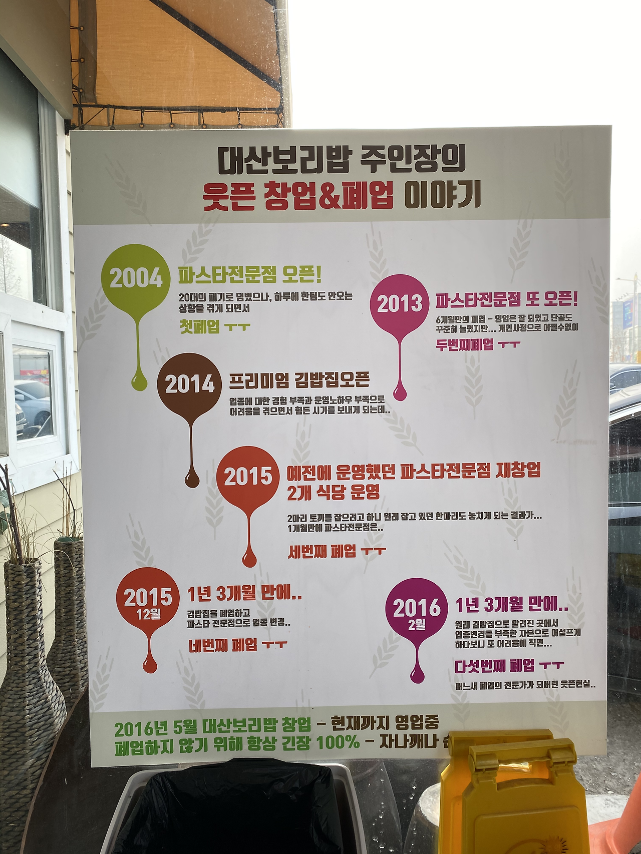 식당 입구엔 사장님의 실패 스토리가 빼곡히 적혀 있었다. 양식 조리학과를 나온 그가 말아먹은? 식당만 여러 개다. 레스토랑과 파스타집, 김밥집, 한 때는 순댓국집을 하기 위해 친척의 식당에서 실습을 한 적도 있었다고 했다. 밤 10시에 잠자리에 들면 1시가 되어 불을 당겨야 했다. 그리고 나서 1시간 뒤에 다시 일어나 돼지 머리를 뒤집어야 했다. 여차저차한 과정을 거쳐 그가 결국 정착한 메뉴는 다름 아닌 보리밥이었다. 그는 정말 보리밥집은 하기 싫었다. 누구나 할 수 있는 쉬운 메뉴로 보였기 때문이다. 하지만 세상에 쉬운 일은 없었다. 기껏 보리밥집이 자리를 잡으니 재개발 사업 때문에 식당을 옮겨야 했다. 이제 마흔을 조금 넘긴 나이, 스물 넷에 시작한 식당은 이제 월 매출 1억을 훌쩍 넘기는 탄탄한 식당으로 자리잡고 있었다.