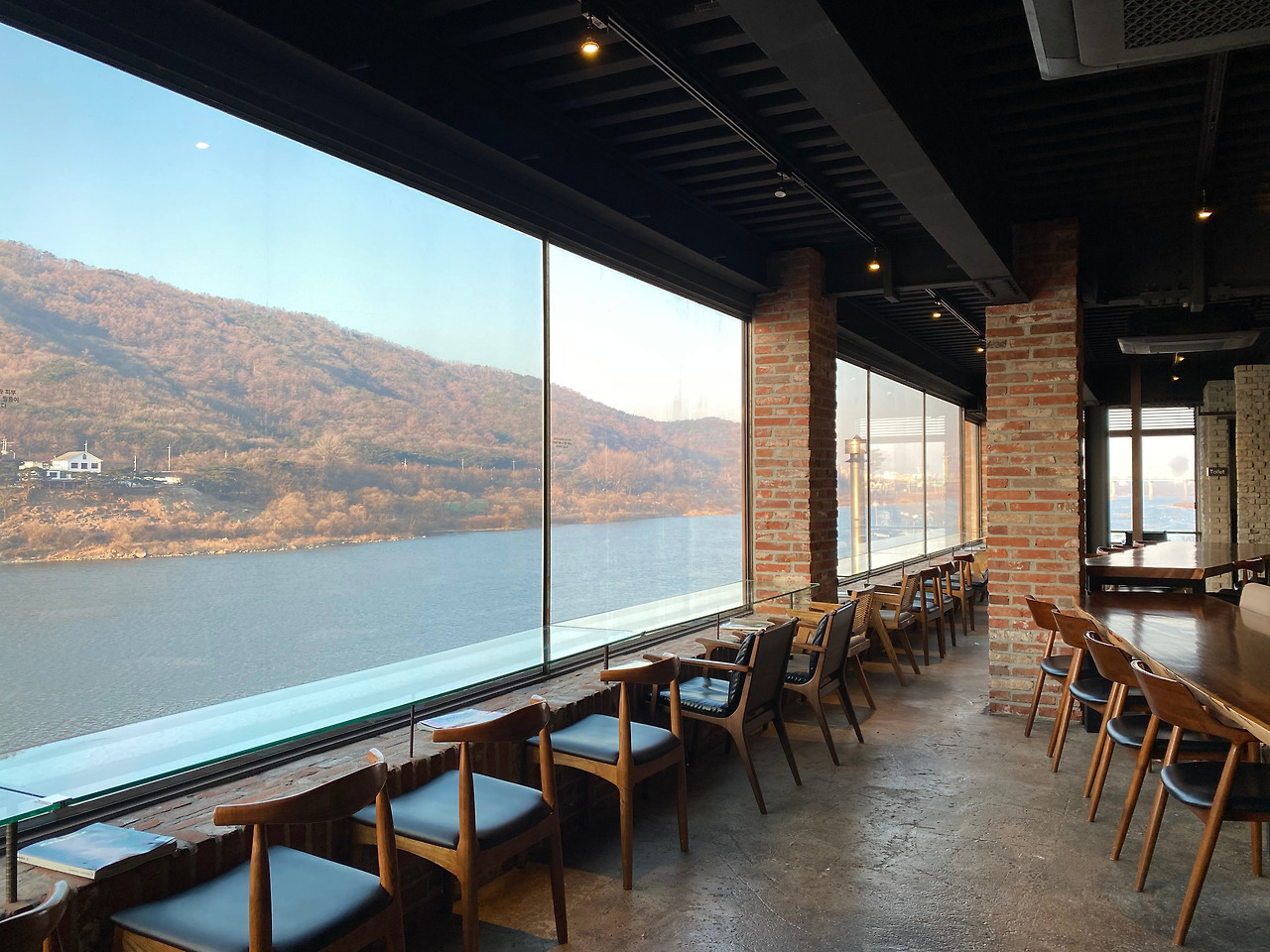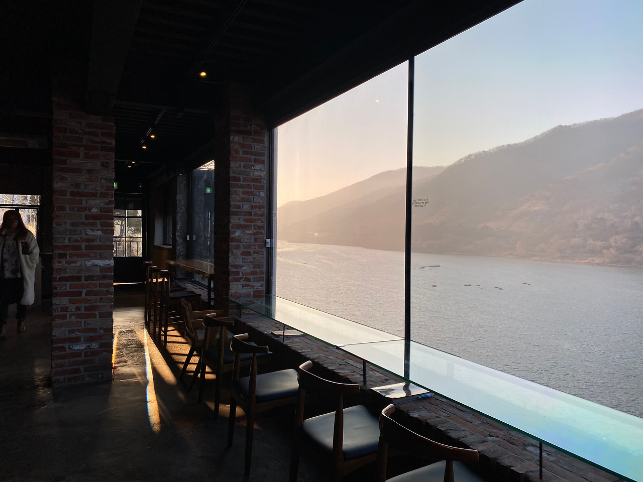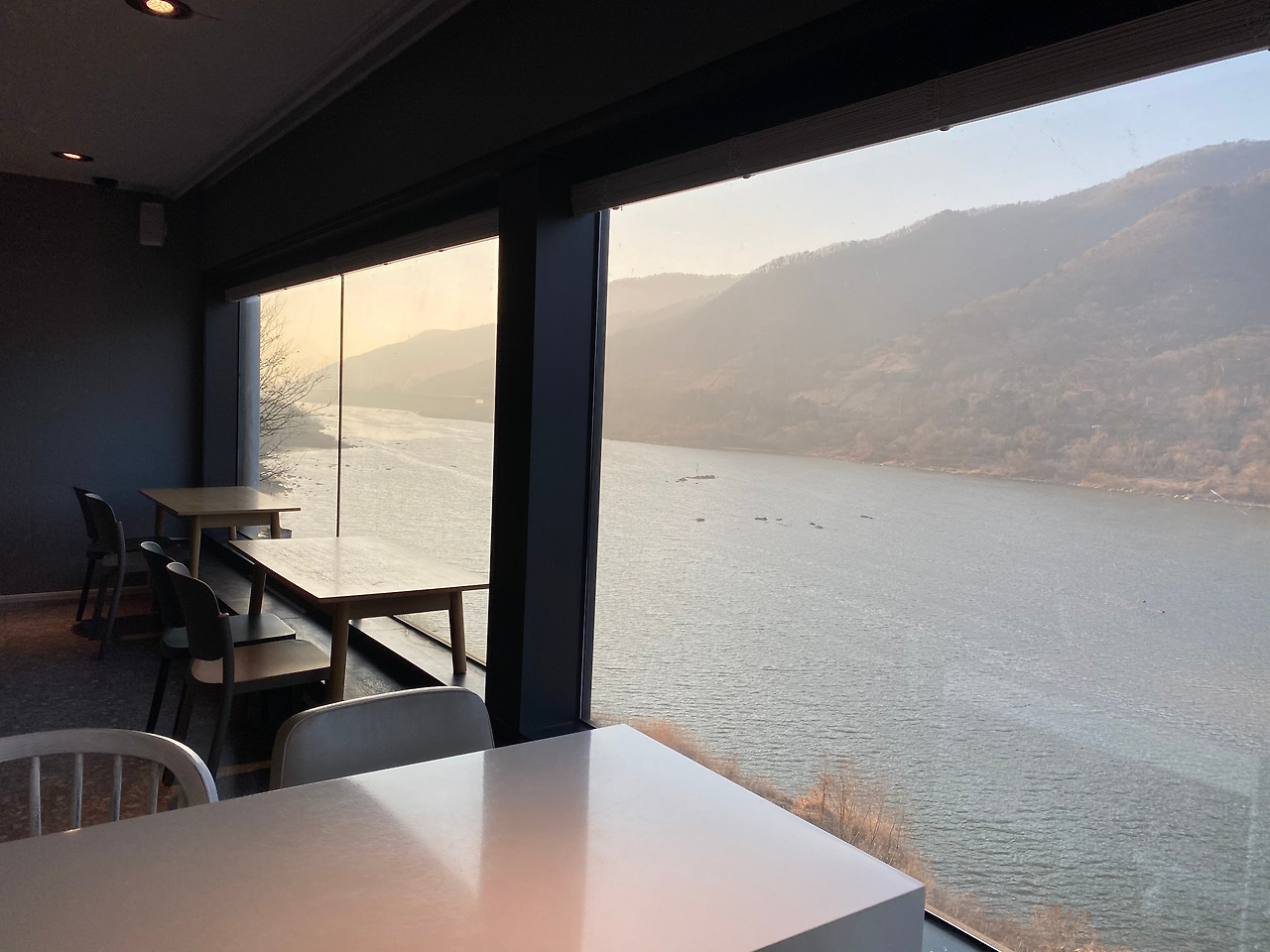 네비를 잘못 잡는 바람에 일찍 출발한 우리 팀이 20분 가량 늦게 도착했다. 그래도 8시 개장인 나인블럭엔 오직 우리만 와 있었다. 먼저 와있던 코리님과 함께 지하 1층에 자리를 잡는다. 그러나 총 3개 층의 이 건물엔 지상과 지하의 차이가 큰 의미가 없다. 모두 동일한 뷰를 제공하기 때문이다. 탁 트인 북한강을 앞에 두고 다섯 명의 운영진이 쪼르르 모여 앉았다. 아직은 난방이 제대로 들어오지 않는지 무릎 아래가 조금은 시린 아침이다. 일단 모이긴 모였지만 특별한 이유는 역시나 따로 없었다. 차 안에서 시작된 수다가 나인블럭에서도 그대로 이어진다. 최근에 축하할 일을 맞은 멤버 한 분이 커피를 쏜다(나중에 점심까지 쏘았다). 그렇게 세 시간을 내리 떠들고 나니 주위가 후끈하다. 어느 새 커플 혹은 가족 단위로 자리를 잡은 사람들로 실내가 빼곡해 진다. 화장실을 다녀 올 때가 되어서야 비로소 주변의 경치들이 한 눈에 들어온다. 새벽의 경치와는 또 다른 모양새다.
