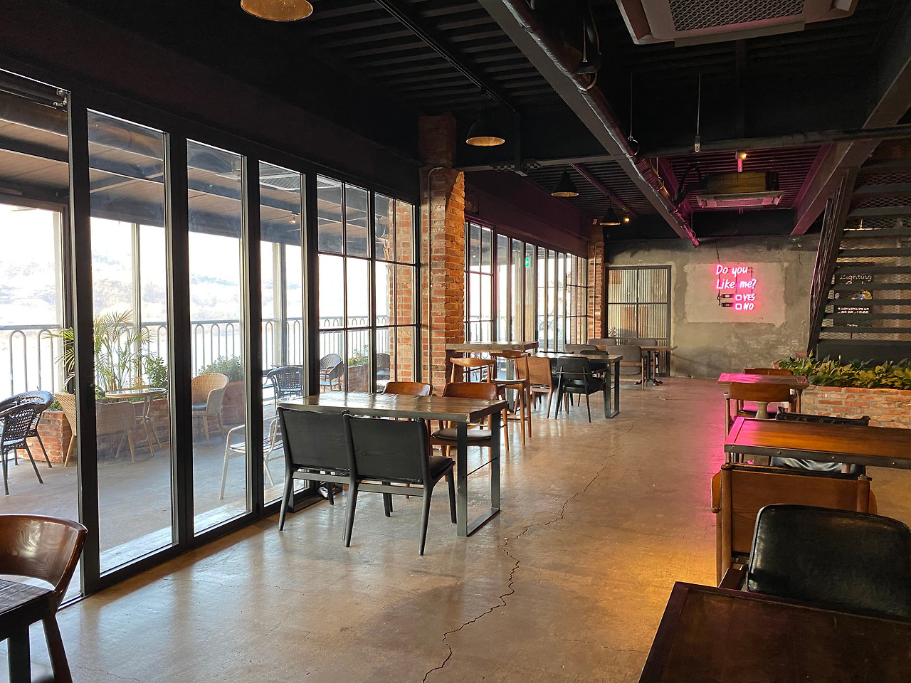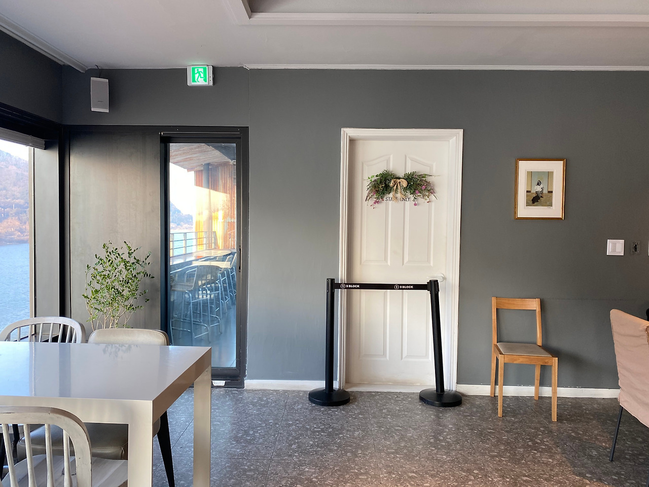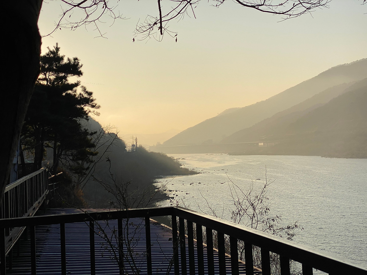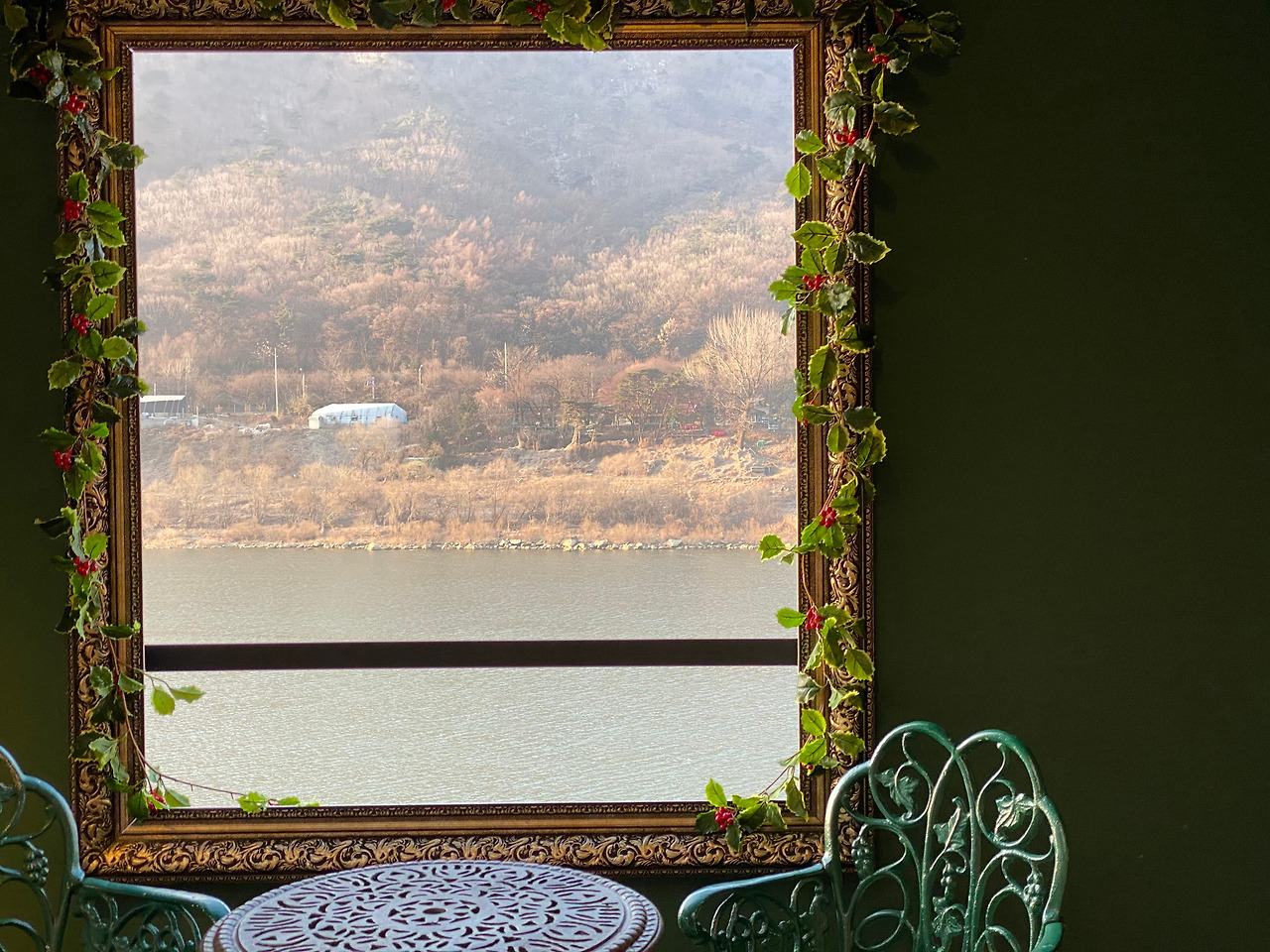 네비를 잘못 잡는 바람에 일찍 출발한 우리 팀이 20분 가량 늦게 도착했다. 그래도 8시 개장인 나인블럭엔 오직 우리만 와 있었다. 먼저 와있던 코리님과 함께 지하 1층에 자리를 잡는다. 그러나 총 3개 층의 이 건물엔 지상과 지하의 차이가 큰 의미가 없다. 모두 동일한 뷰를 제공하기 때문이다. 탁 트인 북한강을 앞에 두고 다섯 명의 운영진이 쪼르르 모여 앉았다. 아직은 난방이 제대로 들어오지 않는지 무릎 아래가 조금은 시린 아침이다. 일단 모이긴 모였지만 특별한 이유는 역시나 따로 없었다. 차 안에서 시작된 수다가 나인블럭에서도 그대로 이어진다. 최근에 축하할 일을 맞은 멤버 한 분이 커피를 쏜다(나중에 점심까지 쏘았다). 그렇게 세 시간을 내리 떠들고 나니 주위가 후끈하다. 어느 새 커플 혹은 가족 단위로 자리를 잡은 사람들로 실내가 빼곡해 진다. 화장실을 다녀 올 때가 되어서야 비로소 주변의 경치들이 한 눈에 들어온다. 새벽의 경치와는 또 다른 모양새다.