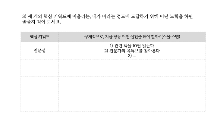 4) 마지막으로 그 단어를 구체화할 수 있는 실천 목록을 적어본다. 나는 이 실천 목록에 '스몰 스텝'이란 이름을 붙였다. 크고 대단한 목표일 필요는 없다. 오히려 당장 시작할 수 있는 아주 작은 실천들이라야 한다. 매일 지속할 수 있는 항목들이면 더욱 좋다.
