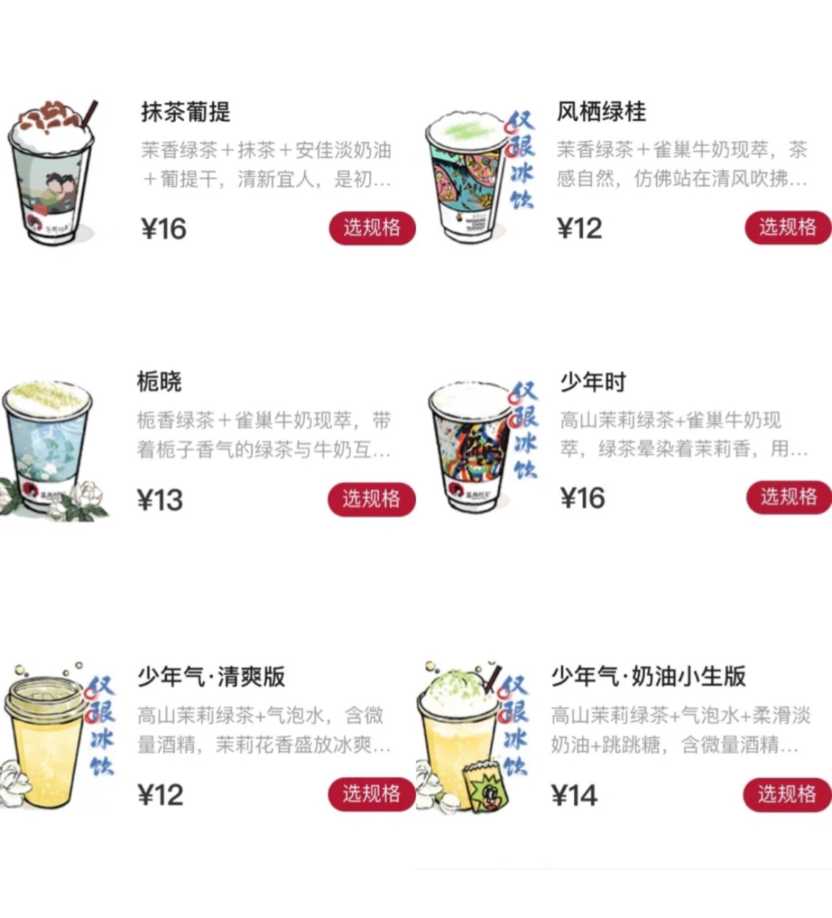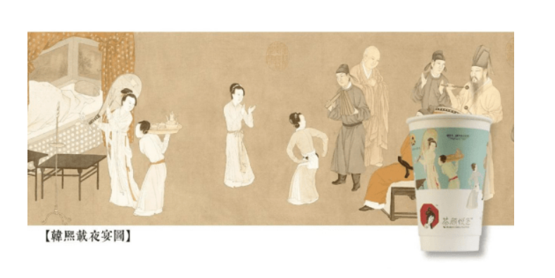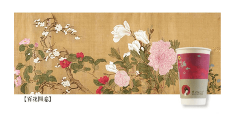 "붉은 빛깔의 팔각창 안에 남방풍 미녀가 둥근 부채를 들고 있는 모습이다. 마치 스타벅스가 그리스 신화에 나오는 사이렌이라는 전설의 인어를 로고에 담은 것의 중국판 버전처럼 느껴진다. 밀크티를 담는 종이컵도 중국 전통 서화가 그림에서 따온 게 대부분이다. 차옌웨써가 사실상 젊은 층 사이에서 전통문화의 대명사가 된 셈이다."