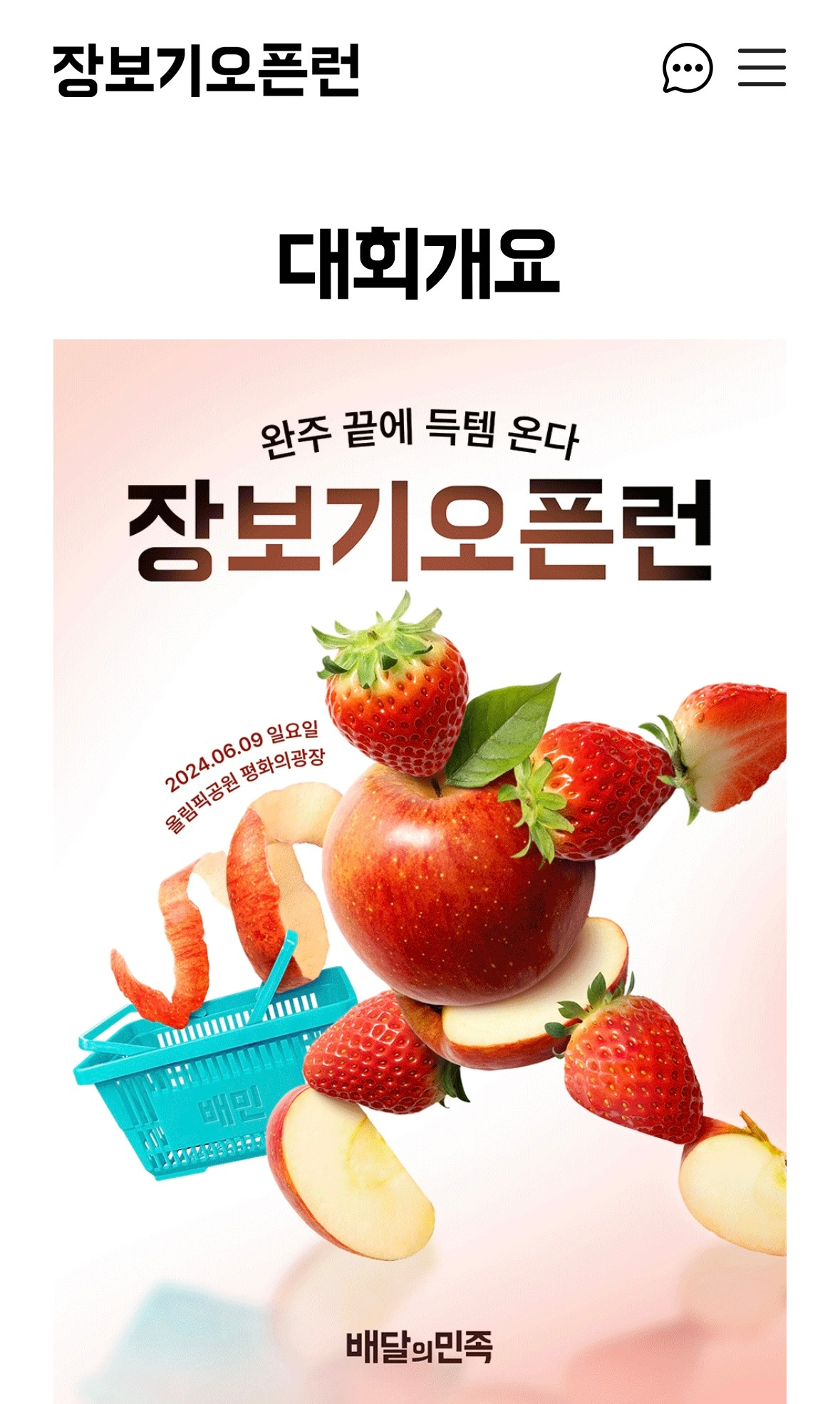 며칠 전, 배민이 주최하는 장보기오픈런 행사 홍보를 보고, 회사에서 마라톤 같이 했던 분들에게 보냈다. 장보기 오픈런이라니. 브랜딩을 하려면 이렇게 해야 한다고. 득템존에서 바구니에 원하는 것 담아 완주하면 그게 다 내 것이 되는 재밌는 기획.