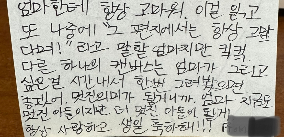 엄마 생일이라고 미니 캔버스 사서 직접 그림을 그려주고 손 편지를 써서 건넨다.