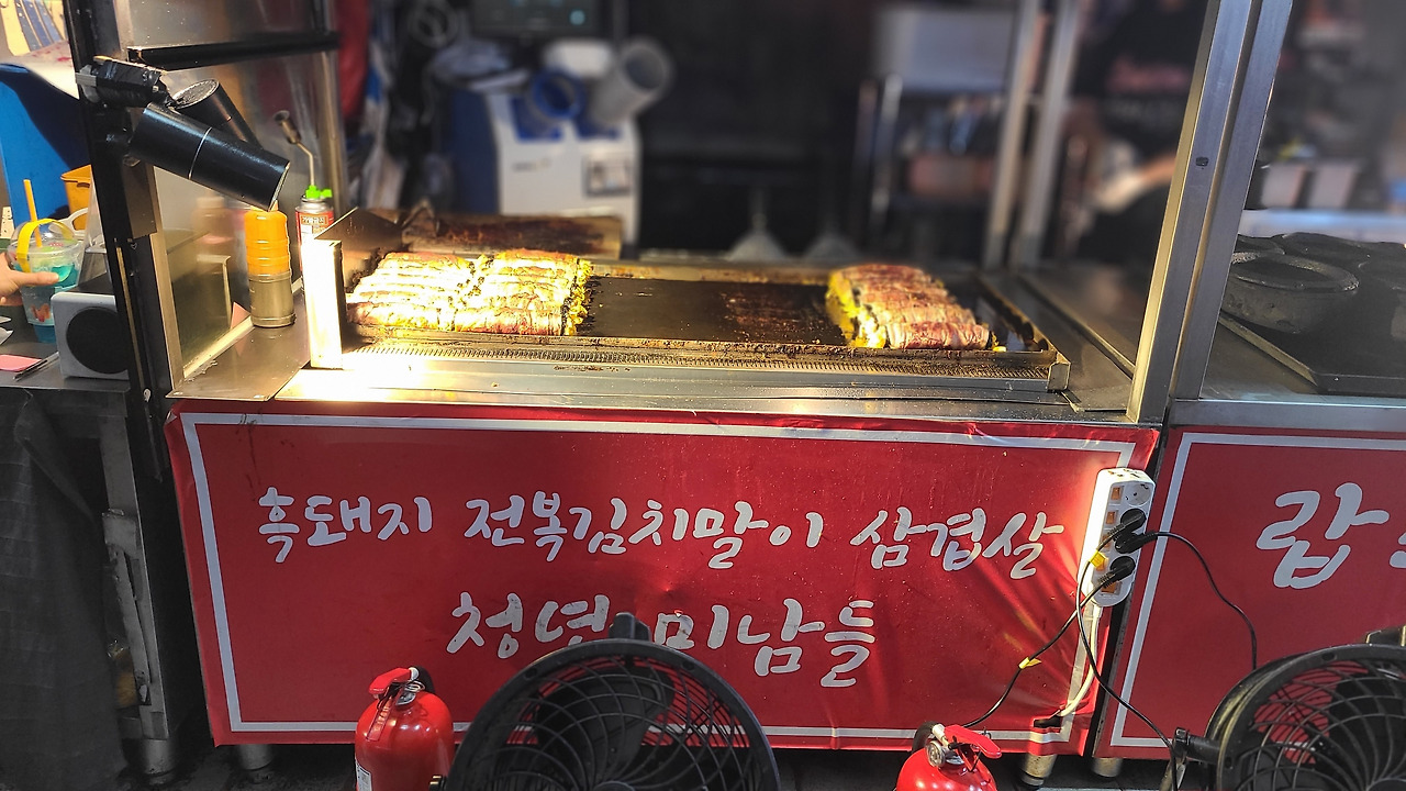 시장을 한 바퀴 둘러보니 시장끼가 밀려온다. 기념품 파는 곳을 지나니 고기 굽는 냄새가 요란하다. 한쪽에서 청년들이 유니폼을 입고 일명 ‘흑돼지 전복 김치말이 삼겹살’을 팔고 있다. 제목에서부터 좋아하는 재료 네 가지가 들어가 있다. 맛이 없을 수 없겠다. 모양은 또 어떤가? 나는 고민하지 않고 김밥인 듯 김밥 아닌 삼겹살김밥을 한 줄 사서 차로 돌아와 끼니를 때운다.