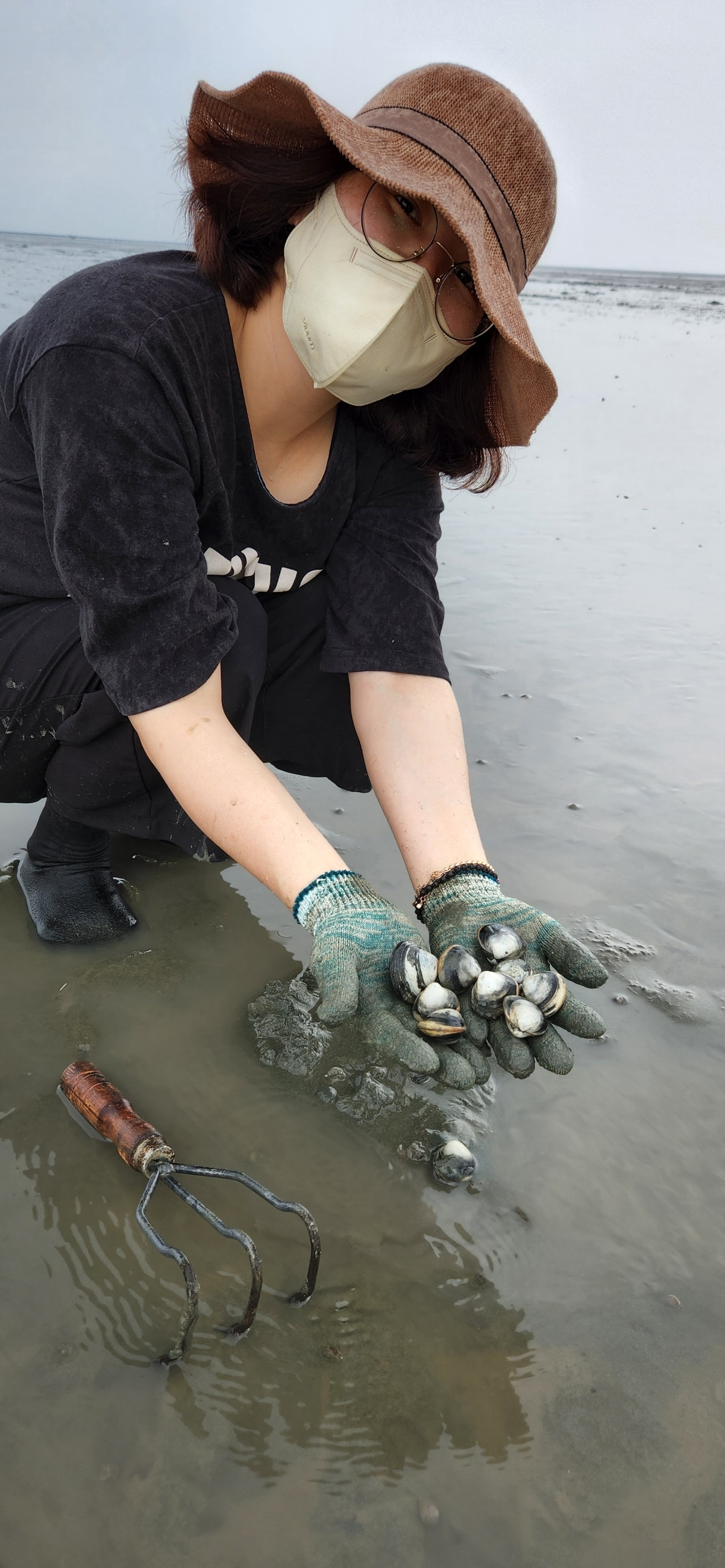 옷을 갈아입고 트랙터에 올라타니 10분 남짓 갯벌로 이동한다. 어찌나 덜컹거리는지 허리가 아플 정도다. 그게 대수겠는가 아내와 아이들 얼굴에 미소가 만연하다. 얼마 만에 보는 모습이던가? 그리고 갯벌에 도착, 주어진 시간은 1시간, 내리기 바쁘게 호미질을 시작한다. 먼저 도착한 사람들은 이미 양파망에 바지락이 가득하다. 언제 다 채우지 걱정도 잠시 호미질 한 번에 대여섯 마리가 눈에 들어온다. 이 정도면 10분이면 다 채우고도 남겠다 싶다. 그러길 10분 정도 지나니 하늘이 심상치 않다. 소나기가 엄청 쏟아진다. 피해야 하는 것 아니냐는 아내의 걱정에도 묵묵부답으로 계속 캔다. 그러길 잠시 쏟아지던 비가 약해지고 호미질이 계속된다. 바지락이 너무 많이 나오니 이제는 큰 것만 망에 담는다. 두 아이도 작은 건 다시 보내고 큰 것만 골라 캐기 시작한다. 어느덧 40분 남짓하니 1인당 주어진 양파망에 바지락이 가득하다. 이제 됐다. 이걸 가져가서 누구랑 나눠 먹을지 잠시 생각하니 기분이 오지다. 물때가 다 되어가니 돌아가잔다. 좀 더 캐고 싶지만 이미 가득 찬 양파망에 더 넣을 데도 없어 기쁜 마음으로 트랙터에 올라탄다. 기분이 만선이다.