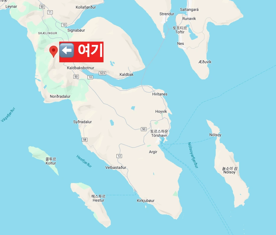 소른펠리는 중부의 스트뢰뫼(Streymoy) 섬에 위치한 산악지대예요. 해발 약 725m 높이로, 1961년 덴마크의 레이더 기지가 들어섰으나 2007년에 폐쇄됐다고 하네요. 그럼 소른펠리로 지도를 찍고 여행을 시작해 볼게요! 토르스하운에서 20분 정도만 가면 돼요.