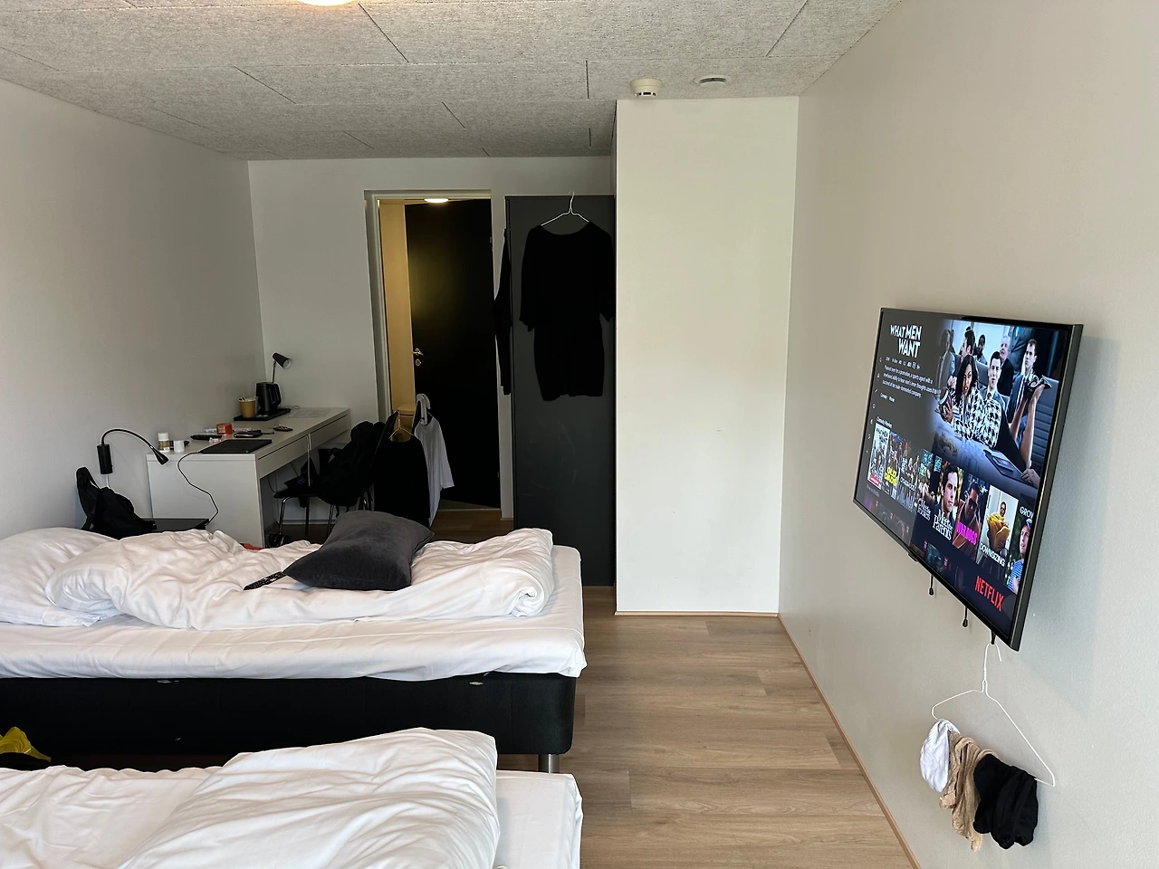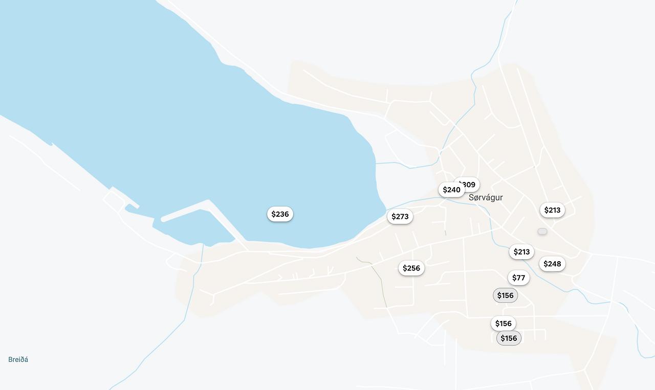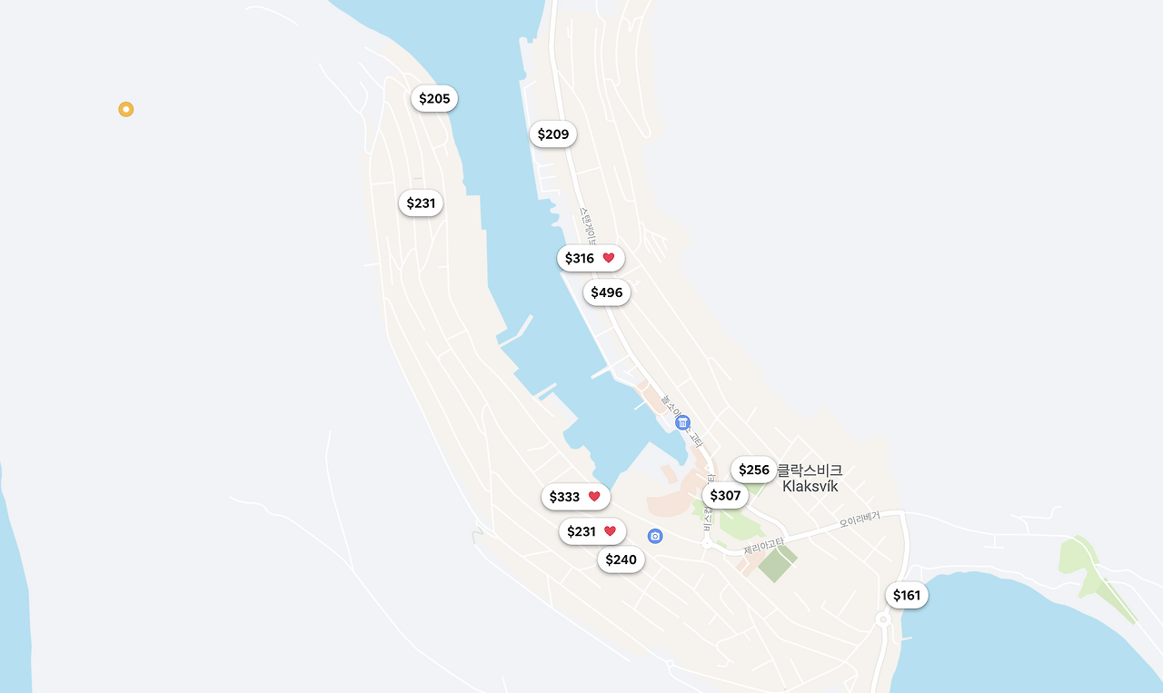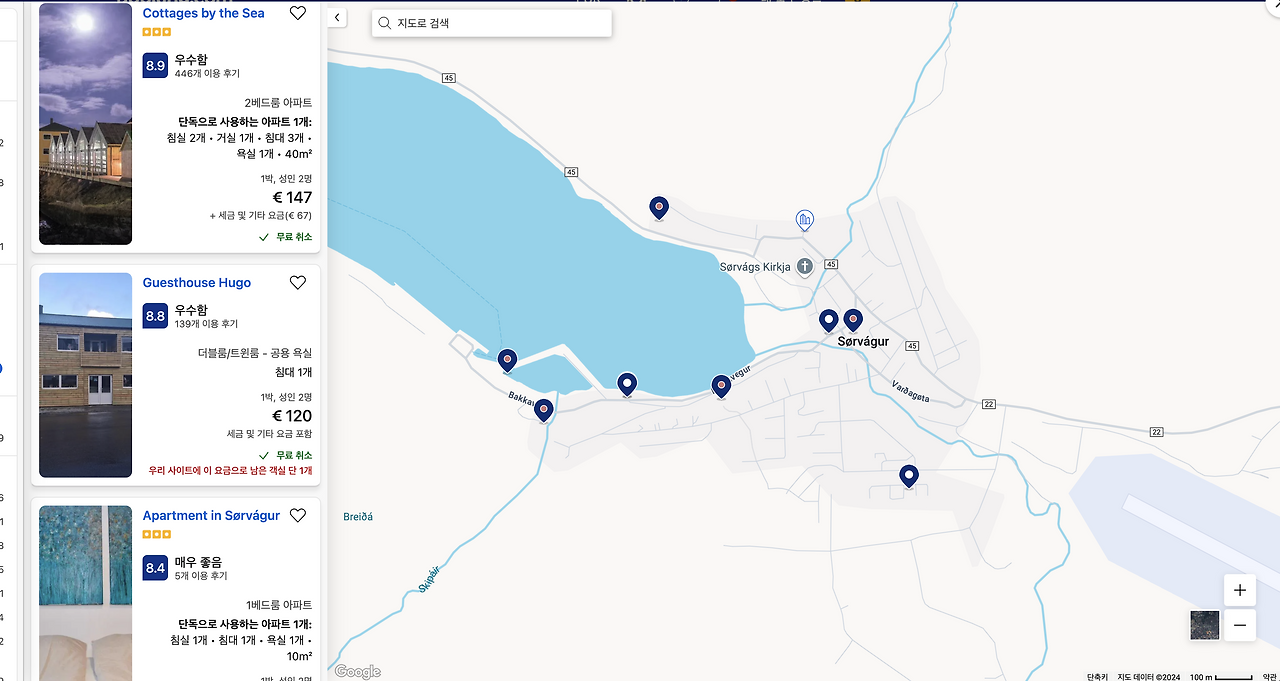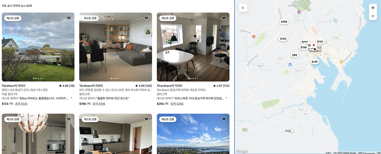 플랫폼에 등록된 소르바구르의 숙소 개수를 비교해 보면, 에어비앤비에 두 배가량 더 많아 선택의 폭이 넓어요. 그리고 왼쪽 사진처럼 부킹닷컴에 등록된 숙소는 아파트/게스트하우스 거나 에어비앤비처럼 사용하는 방의 형식이 대다수라 호텔식 시스템의 장점을 기대하기 어렵기도 하고요.