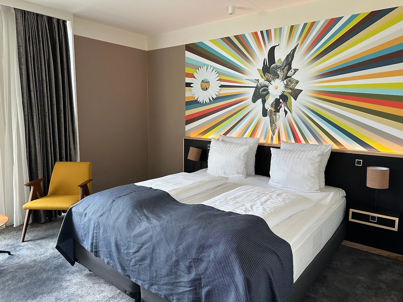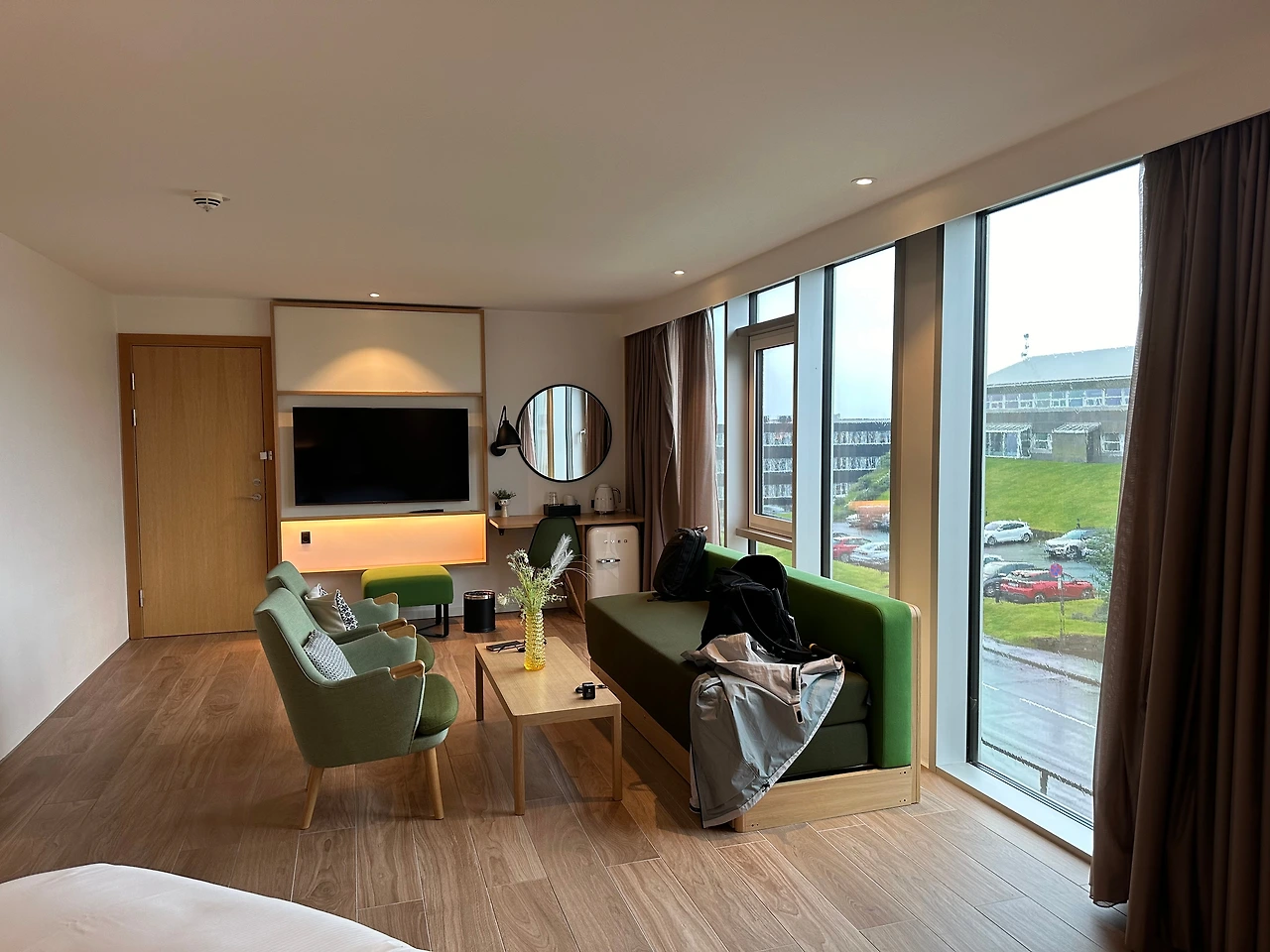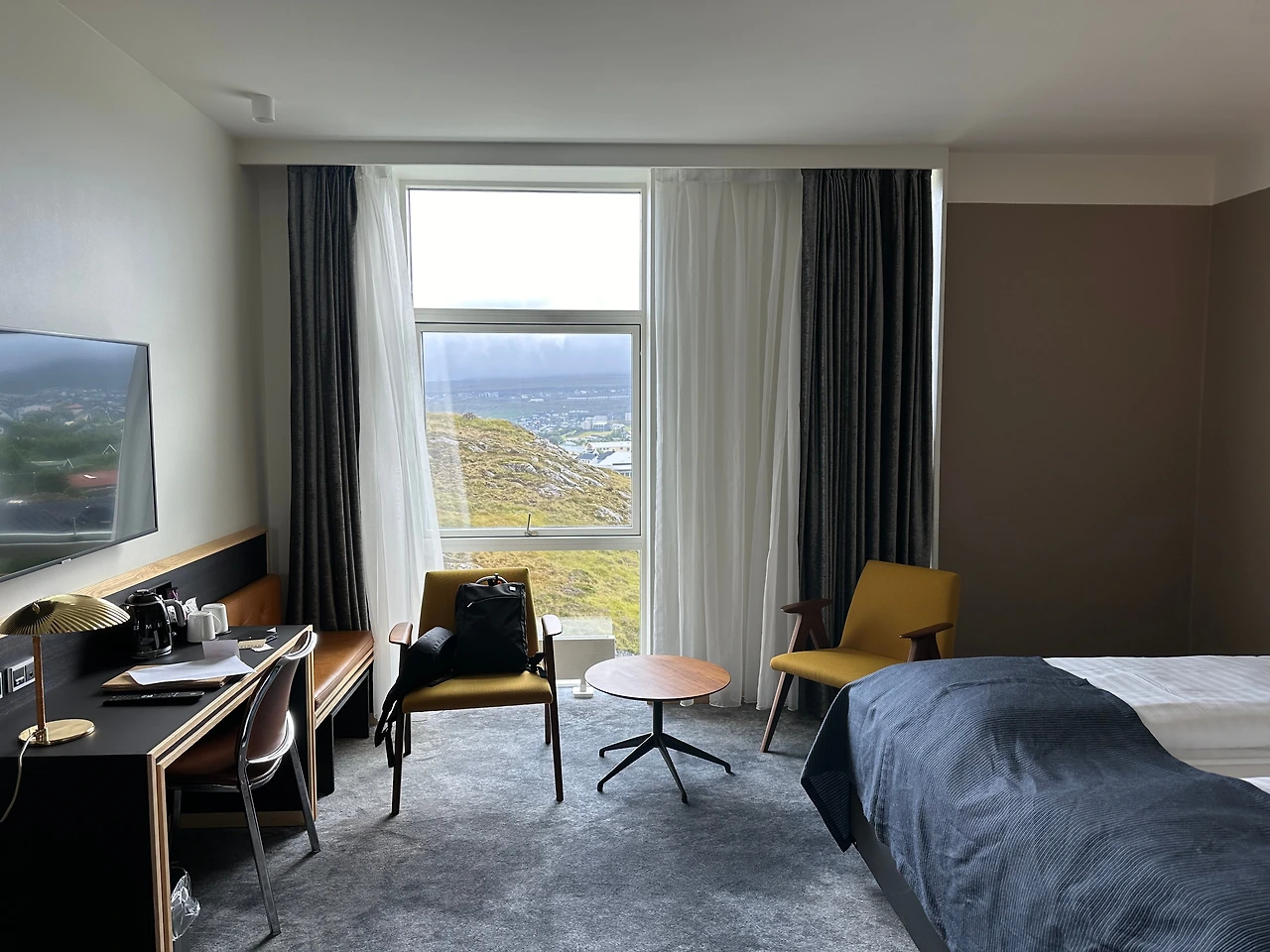 방마다 뷰가 다르니, 토르스하운의 전망을 보고 싶다면 꼭 전망이 있는 방을 선택하세요. 첫 번째 방은 장애인 이용 가능한 킹 룸, 두 번째 방은 전망이 있는 트윈룸이에요.