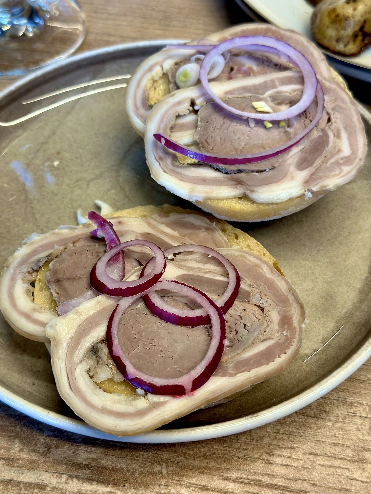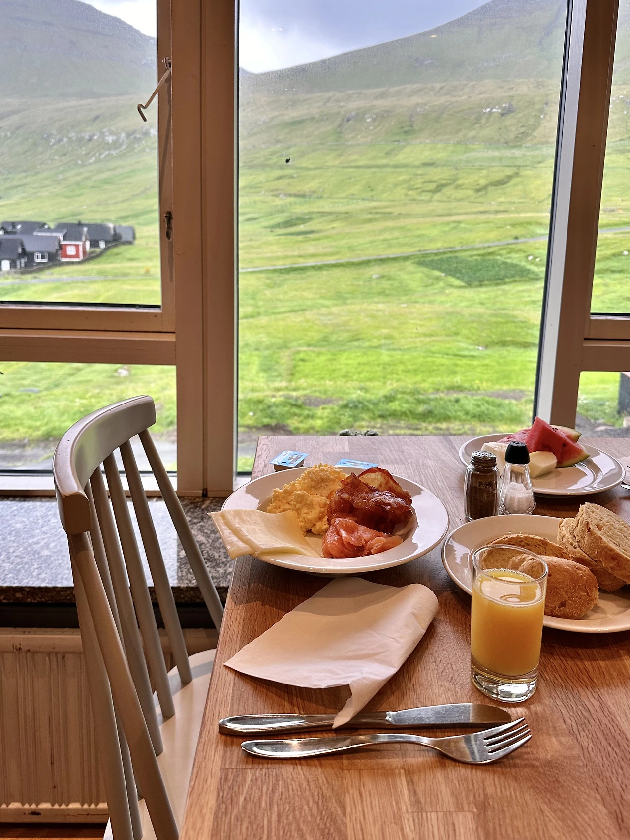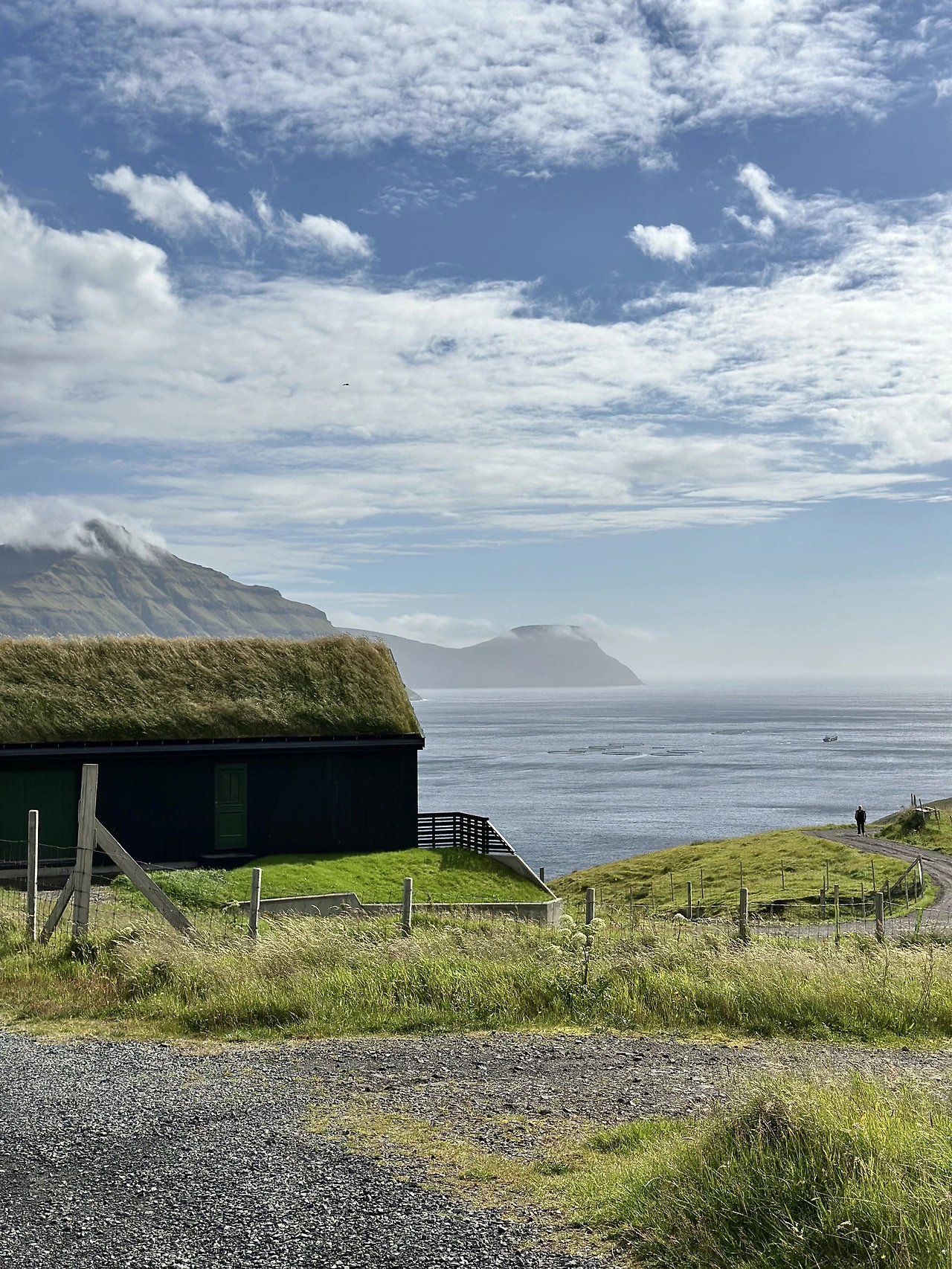 식당에 들어가려는데, 아빠가 문 앞에 멀뚱멀뚱 서 있다. 전날 저녁을 먹은 식당과 같은 장소였는데, 아마 저녁 식사는 문 앞에서 기다렸다가 예약자 명단을 확인하고 들여보내는 시스템이라 아빠가 또 들어가도 되는지 헷갈렸던 것 같다. 들어갔는데 캐나다에서 온 부부가 어제와 똑같은 창가 자리에 그대로 앉아 있어 웃음이 났다. 식사를 하며 아빠는 이 동네는 참으로 깨끗하다고 얘기하면서 전날 찍은 페로의 집 지붕 사진을 보여줬다. 이곳은 지붕에 잔디를 심어놓는 경우가 있는데, 그게 그냥 풀을 심은 게 아니고 바람에 날아가지 않도록 고정 장치를 해두었다는 걸 알게 됐다고 자랑스럽게 말씀하셨다. 아빠가 여기와 레퍼런스를 얻어간 것 같아 다행이다.