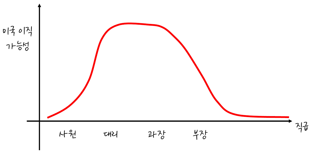 단적으로 말하면 미국 직접 이직은 그 시점이 빠르면 빠를수록 좋다. 늦을수록 그 난이도가 올라간다는 말이다. 이는 개인의 능력치와 별개로 '현실적인 면'도 작용하기 때문이다. 아래 그림을 보자. 한국에서 직급, 연차가 쌓일수록 미국 이직 가능성의 추이를 간략히 도시화한 것이다.