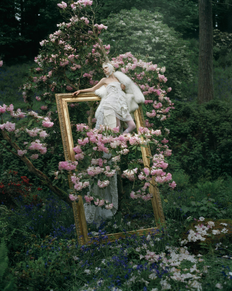 <보그 전>에서 이 사진이 가장 인상적이었습니다. 수목의 푸르름과 그 위로 흐드러지게 피어난 꽃의 연분홍이 조화롭고 풀잎에 섞인 빨강, 파랑 꽃이 강세를 띄웁니다. 액자 프레임 위의 여인은 그림에서 막 빠져나온 걸 까요. 색감과 구성이 신비하고 몽환적인 느낌을 줍니다. 이 사진이 주는 화려한 분위기는 특정 미술사조를 생각나게 합니다. 사치와 향락의 미술, 18세기 프랑스의 로코코죠. 그렇습니다. 이 사진은 로코코 미술을 대표하는 화가 장 오노레 프라고나르의 <그네>를 가져온 것입니다.