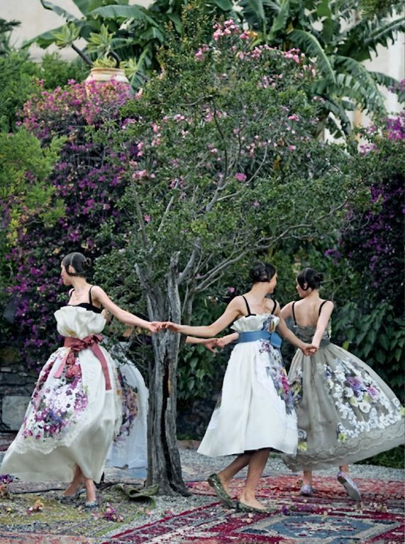 이 사진은 이탈리아 남부 타오르미나라는 작은 도시에서 보그의 간판 사진작가 피터 린드버그에 의해 촬영되었습니다. 지중해 감성이 물씬 느껴지는 꽃과 나무가 아름다운 정원에서, 네 명의 모델이 한 그루의 나무를 중심으로 손을 잡고 춤을 추며 돌고 있습니다. 흡사 강강술래를 생각나게 하는군요. 나무에 핀 꽃과 무희들 의상에 화려하게 수 놓인 꽃이 참으로 조화롭습니다. 게다가 <마법에 걸린 저녁>이라니 작품 제목이 참 매혹적입니다. 이 사진에 마법을 건 그림은 바로 푸생의 <세월이라는 음악의 춤>입니다.