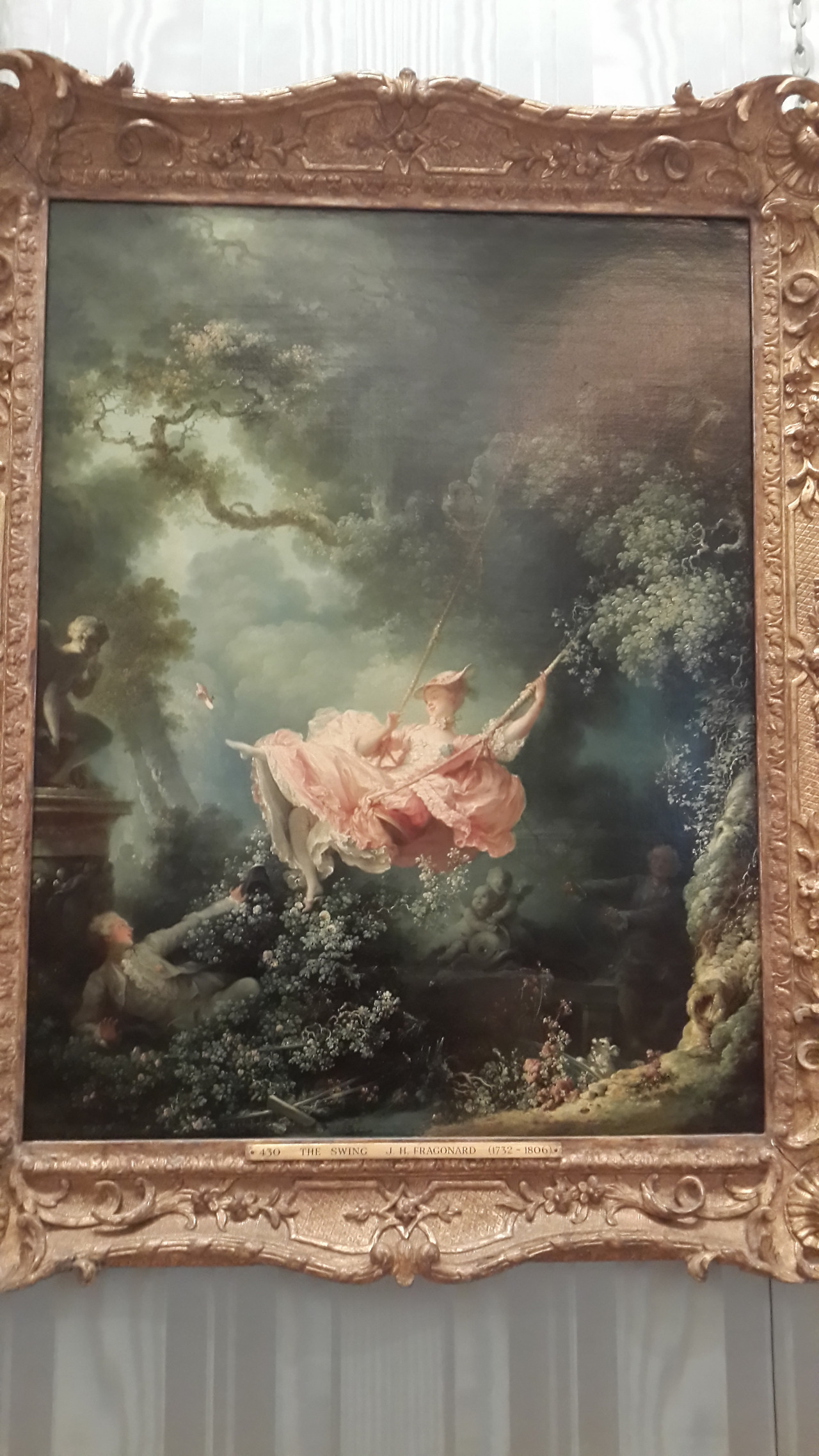 프라고나르의 <그네>는 개인적으로 인연이 많습니다. 이 그림은 2009년 예술의 전당에 방문한 적이 있습니다. 덕분에 로코코 미술을 처음 접했지요. 이후 2014년 런던 왈라스 컬렉션에서 다시 만나니 참 반갑더군요. 그네를 타고 있는 아가씨는 그대로였습니다. 연인 앞에서 그네를 타는 그녀의 표정에서, 한껏 관능미를 뽐내려는 의도인 듯 하지만 왠지 익살스러움이 느껴집니다. 그래서인지 그네를 밀어주는 집사의 표정에서도 주변의 조각들의 시선에서도 미소가 묻어납니다.