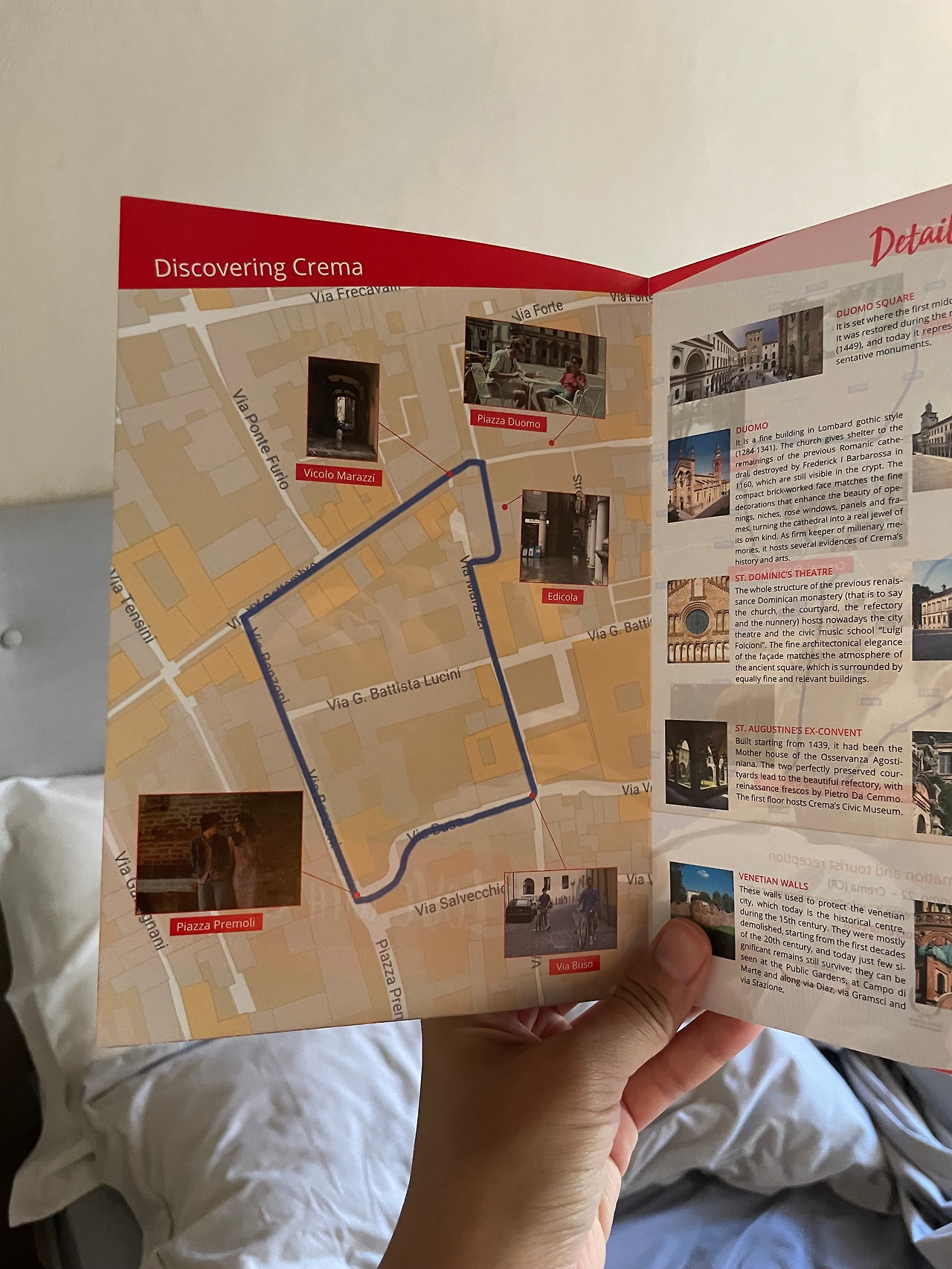 내가 크레마에 머물던 3박은 불금과 주말이 포함되어있었는데 덕분에 매일 저녁 크레마 현지인들의 불타는 주말을 만날 수 있었다. 다들 한껏 들뜬 표정으로 주말 저녁을 즐기러 가는 표정들인데 어디들을 가나 싶어 걷는 행렬에 섞어 걸어봤지만, 어디 그럴싸하게 파티가 열리거나 북적거리거나 하는 곳은 없었다. 생각해보면 나 또한 금요일 저녁부터 특별한 일이 없더라도 맘 맞는 사람들 만나 밥 한 끼 먹는 것만으로도 즐거웠으니 이들도 그러나 보다 싶었다. 중학생 정도 보이는 여자아이가 짧은 바지에 나시 크롭탑 입고 아빠가 태워준 차로 놀러 나오는 거 보면 조용한 것 같은 이 작은 도시 사람들도 맘 편히 먹고 떠드는 주말 저녁에 진심인 것이다.