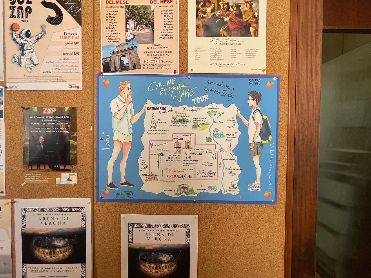배불리 먹고 한숨 자고 나면 슬렁슬렁 다시 나와서 크레마 시내 곳곳을 다녔다. 크레마 시내에도 콜바넴 촬영지가 있어서 찾으러 다니느라 좀 돌아다녔는데, 대부분 촬영지가 고개만 돌리면 보일 정도로 가깝다. 특히, 크레마엔 콜바넴 팬들 취향 저격하게 관광 안내소가 잘 되어있다. 영화 속 배우들이 탔던 자전거와 앉았던 의자 등 소품들이 있고 관련 굿즈도 팔고 있다. 내가 지나칠 때마다 문이 닫혀있어서 주말엔 안 하나 싶었는데, 점심시간에 길게 쉬는 듯했다.