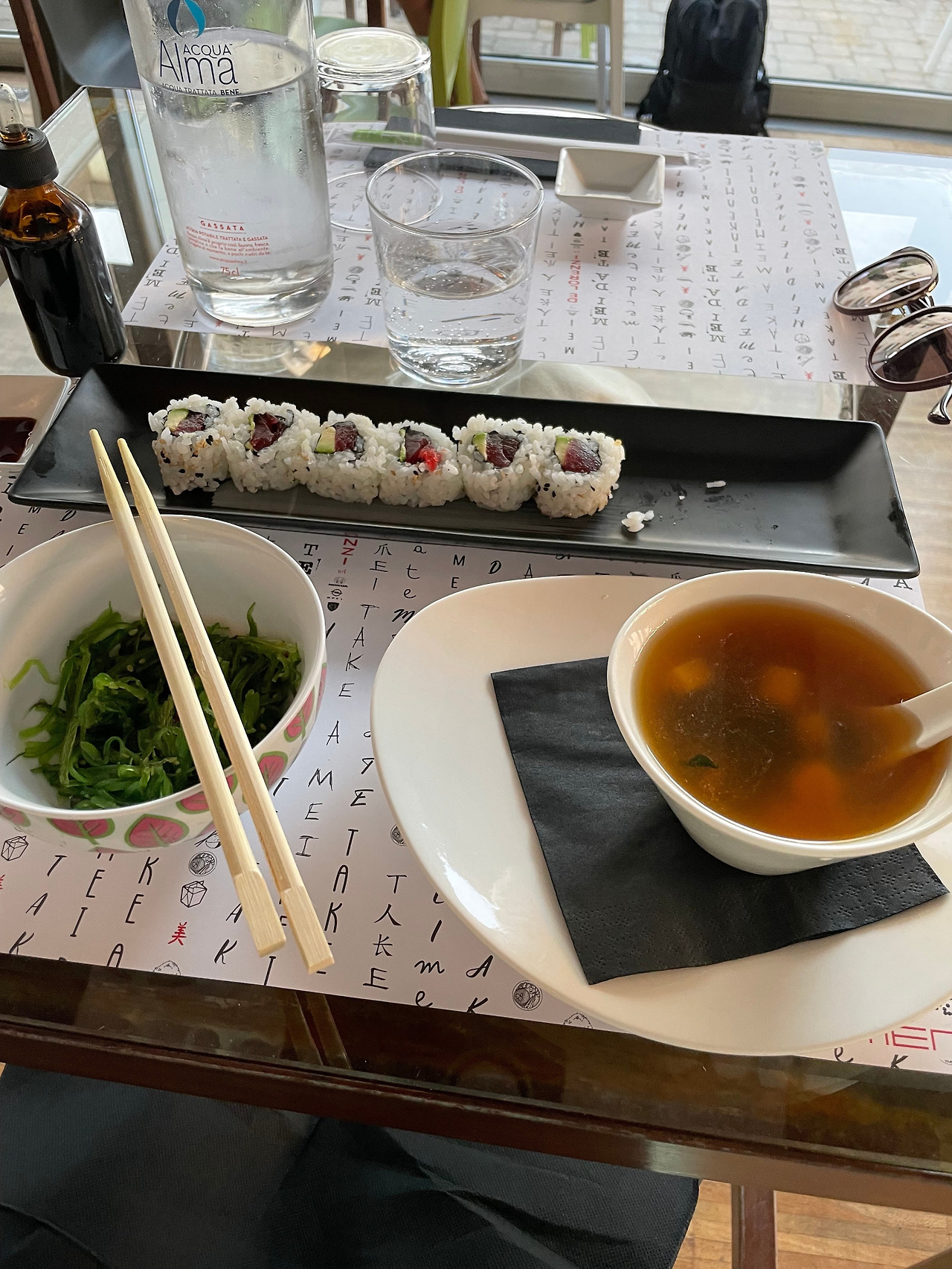 현지의 분위기에 맞춰 크레마의 마지막 저녁은 크레마 시내 끝자락에 있는 일본 퓨전 레스토랑에서 외식으로 즐겨봤다. 4일을 더위에 시달렸더니 기력 보충을 할 뜨끈한 국물이 생각나서 동양 음식을 찾았는데 마침 미소된장국을 팔고 있었다. 생각과는 다르게 BPM 높은 댄스음악을 틀어놓은 젊은 느낌의 식당이었고 메뉴판도 QR코드를 찍어 볼 수 있었다. 동양의 요리를 팔지만 키친 안의 요리사 외엔 홀에 있는 동양인은 나 하나인 게 재밌었다. 살펴보니 식당에 있는 서양인들 젓가락질이 어설펐는데, 뭔가 젓가락질은 이렇게 하는 것이다! 하고 보여주고 싶었다. (젓가락질 부심) 나 역시 젓가락질을 못했는데 고3 때(공부 빼고 다 열심히 하고 싶은 그 시절) 바닥에 콩 뿌려 놓고 열심히 교정해서 지금은 잘해서 갑자기 젓가락질 부심이 솟구쳤다. 크레마의 마지막 밤을 캘리포니아롤과 해초무침을 현란한 젓가락질로 집어대며 서양인들 틈에서 혼자 뿌듯함을 느끼던 여름 손님이었다.