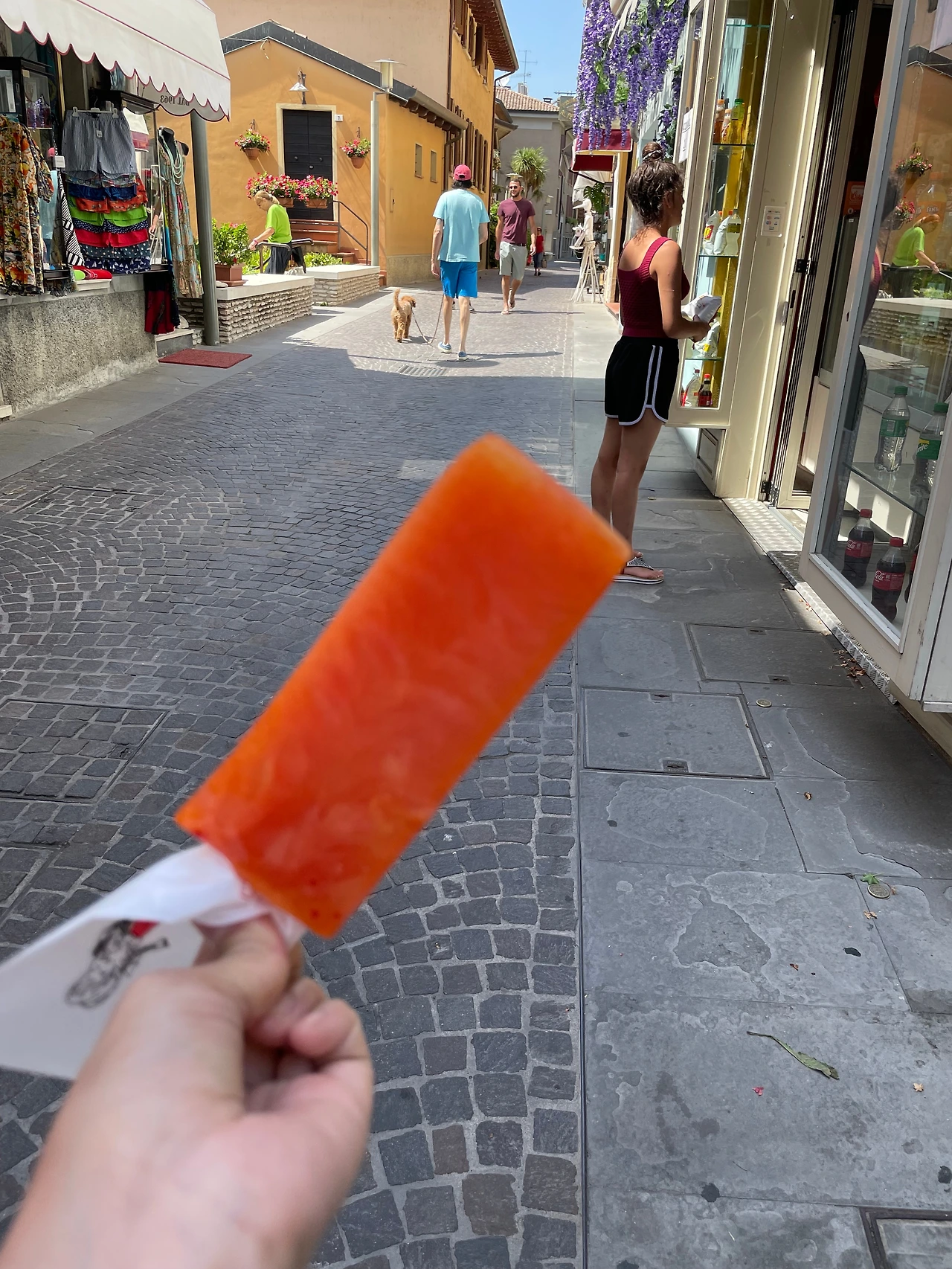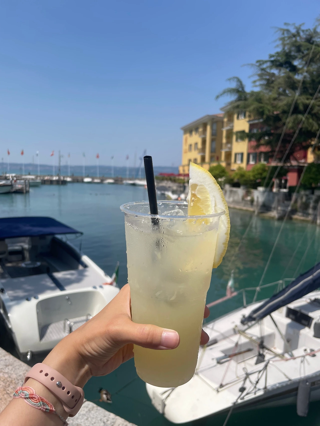 생각해보니 명절 연휴에 걸쳐 여행을 가느라, 대부분 추석 시즌에 가서 이렇게 봄, 여름 날씨에 유럽에 온 게 처음이었다. 내 눈은 호강할 정도로 가르다 호수를 즐기기 좋은 상황이었지만, 이어지는 대중교통 수난에 스트레스는 물론, 몸은 더 폭염을 견디기 힘들어했다. 이탈리아 여행 다니며 큰 얼음이 들어있는 음료들을 만나기 힘들었는데 시르미오네 들어가는 입구에서 큰 얼음이 든 레모네이드를 팔고 있어서 한 잔 사들고 걸어 들어갔다.
