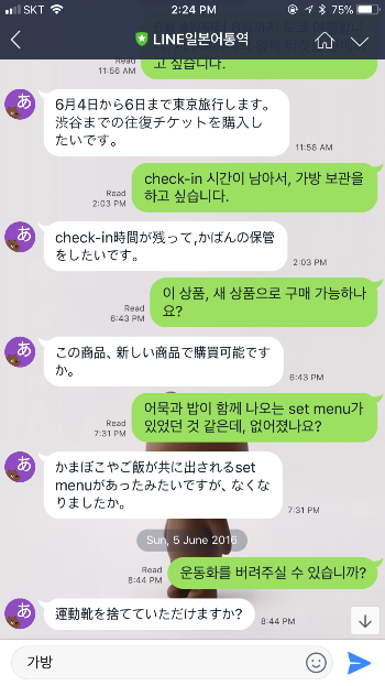 이제는 번역기 앱이 많이 좋아져서 웬만한 앱을 깔면 되는데, 개인적으론 라인(LINE)을 추천한다. 일본인들에게 친숙한 앱이기도 하고 번역도 곧잘 되는 듯하다. 요즘엔 빈번하지만, 이런 걸 잘 활용 안 할 때 라인을 활용해서 일본어로 번역하여 보여주면 호텔이고 가게고 모두 "스고이"를 외치며 놀라워했었다. 호텔이나 공항은 영어가 통해도 매장에서는 번역기를 사용해 보여주면 좋다. 대답을 듣고 싶을 때는 일본어 자판을 켜주고 핸드폰을 주면 좋다. (그렇다면 핸드폰에 일본어 자판 설정 정도는 해두는 게 좋겠고)