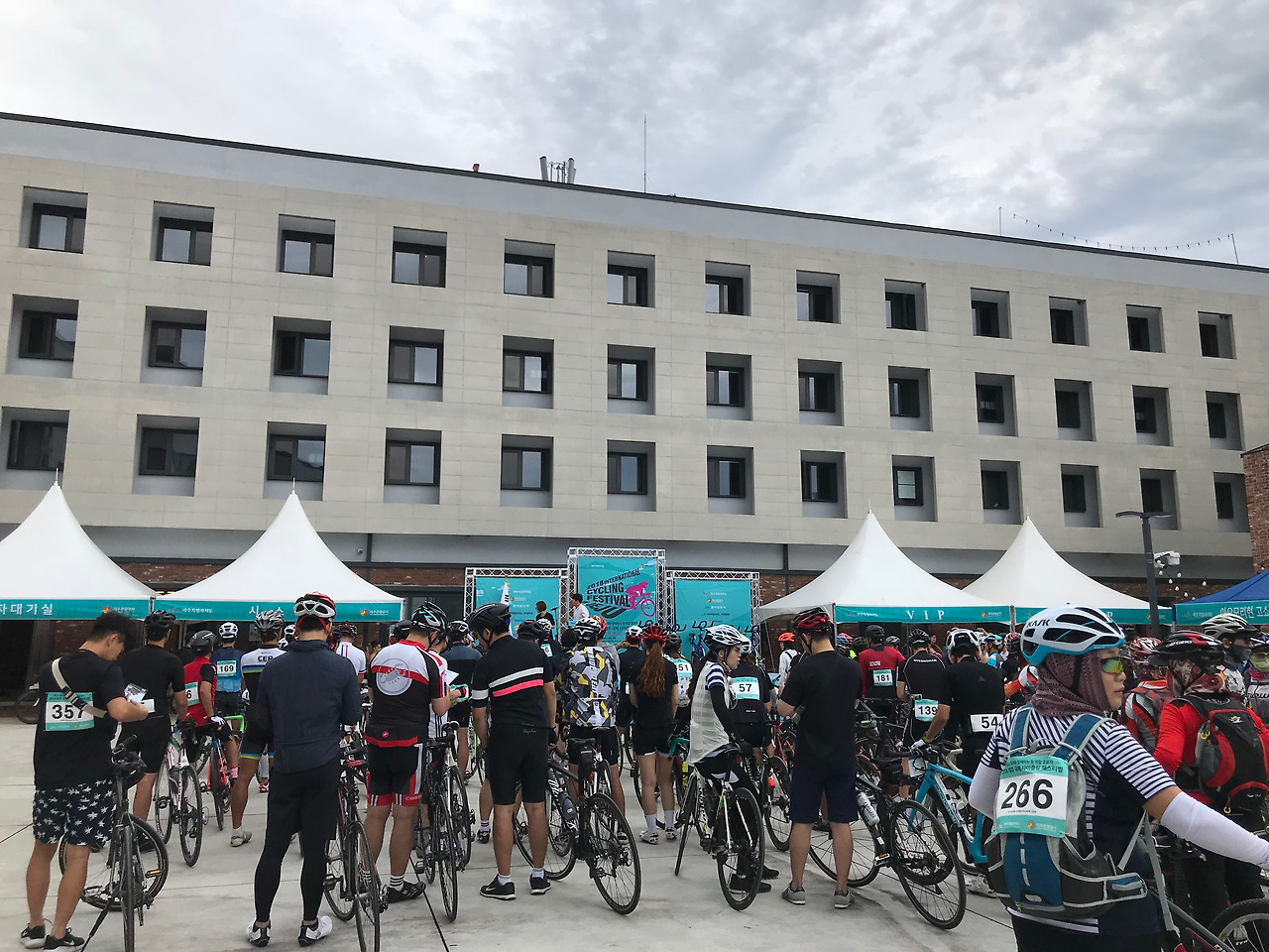 사이클링 페스티벌의 시작점은 (내가 좋아하는) 성산의 '플레이스 캠프'였다. 내가 도착한 날도 자전거를 끌고 온 라이더 분들이 하나둘씩 보였다. 플레이스의 광장은 이미 행사 무대와 천막 등이 다 설치된 상태였다. 자신의 번호를 확인하는 안내판도 미리 설치되어있길래 일찌감치 확인할 수 있었다. 내 번호를 확인하고 나니 올해 제대로 자전거를 타보지 못한 것이 걱정되기 시작했다. 시속 15km 이하면 후미 버스에 태워서 간다고 했는데 내가 타는 속도를 재어 본 적도 없었다. 괜히 왔나 싶은 생각을 밤새 했던 것 같다.