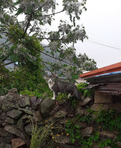 또 한 번은 담벼락 옆에서 창고로 들어오려고 하는 녀석과 눈이 마주쳤다. 그러나 나를 보고 잽싸게 담 너머로 도망을 갔다.