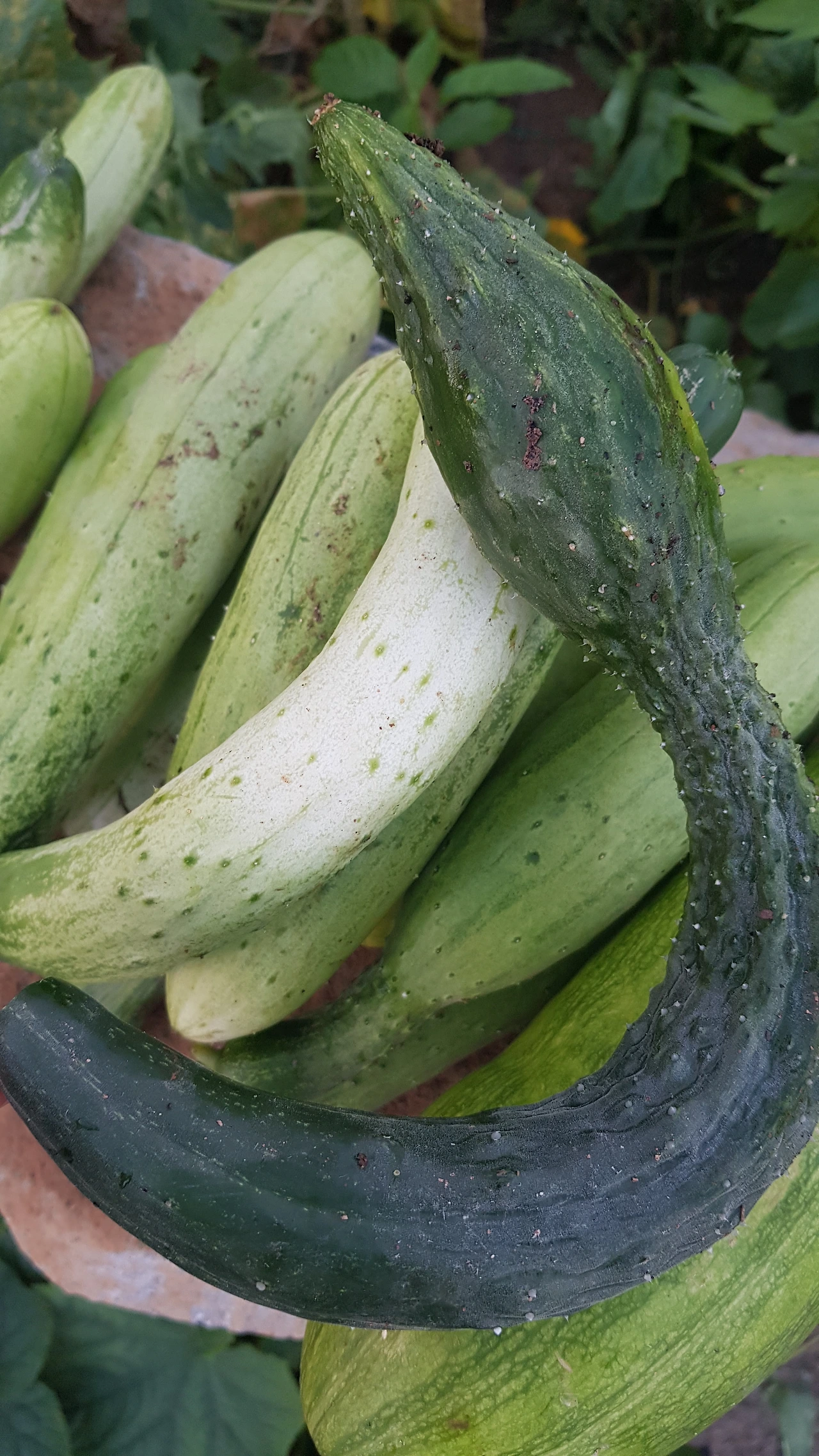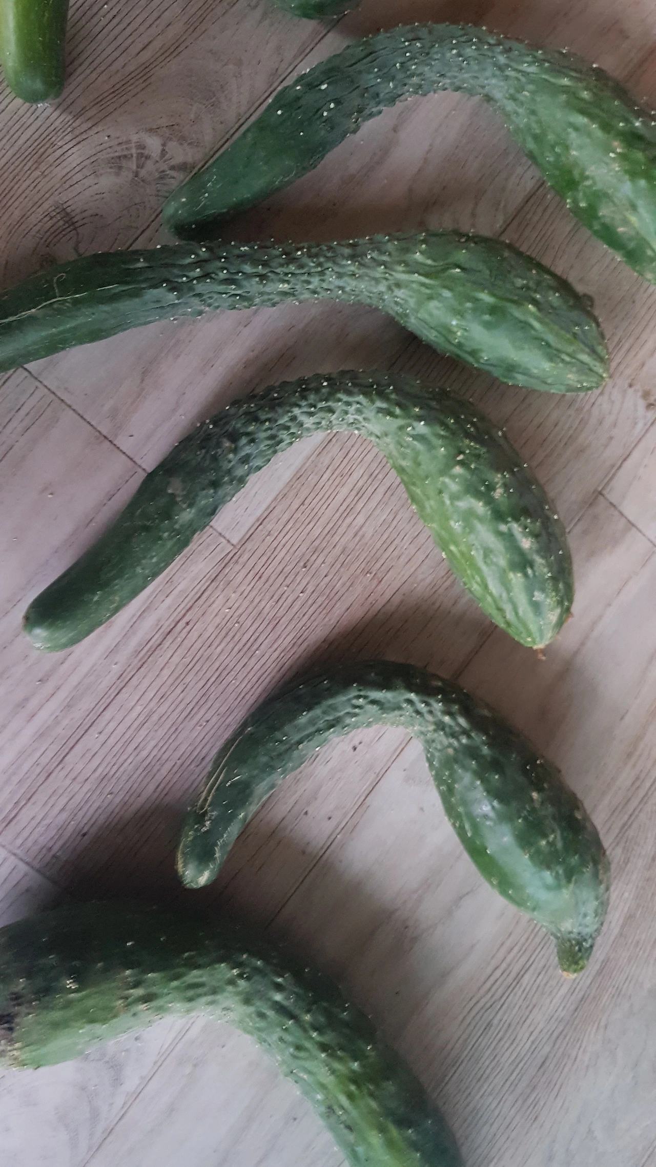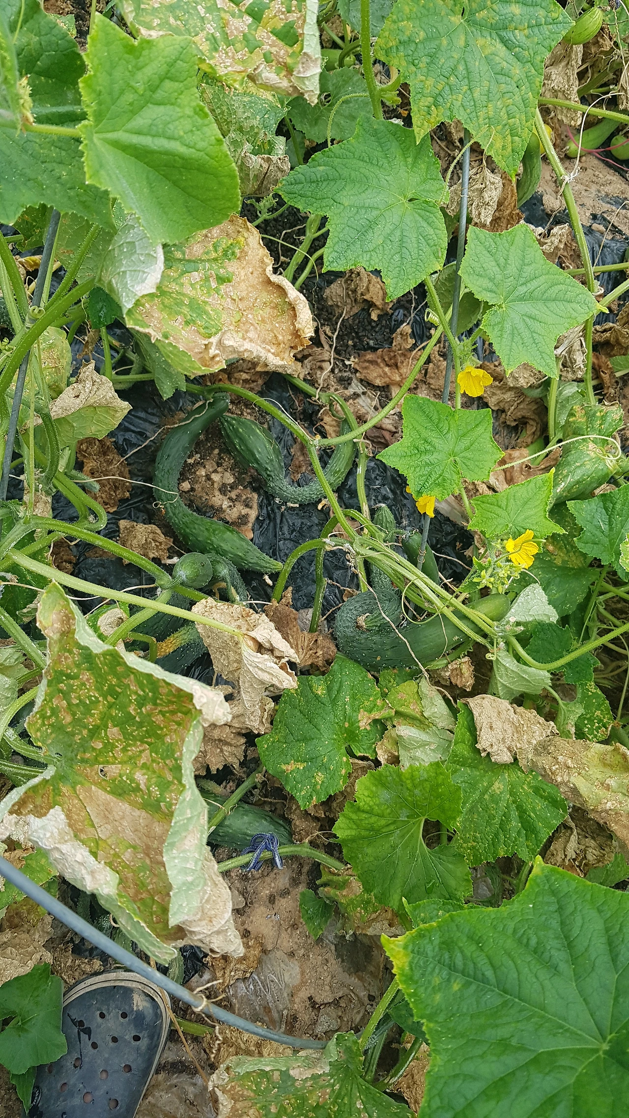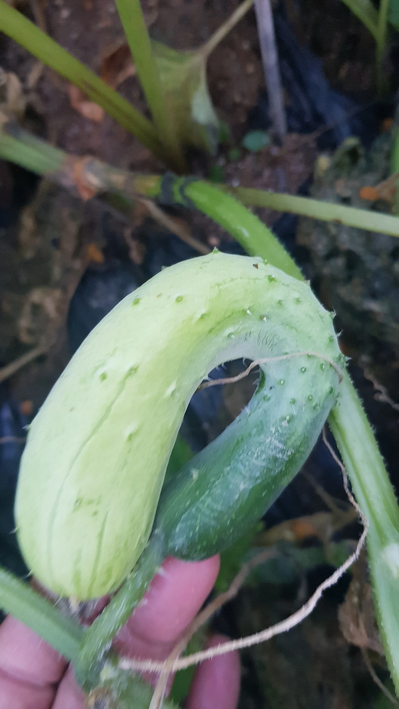 그런데 이번 주에 새로 만난 아이들은 못생겼다는 것으로 끝나지 않았다. 비가 내리지 않아 거의 전멸이려니 했는데 마른 잎사귀 사이로 오이는 잔뜩 열려 있었다. 그런데 자세히 보면 볼수록 그 모습이 가관이다. 생전 처음 본 오이의 모습이었다. 허리는 거의 꼬부랑 할머니고, 너무 구부려진 나머지 숫자 모양으로 자란 오이도 있다.