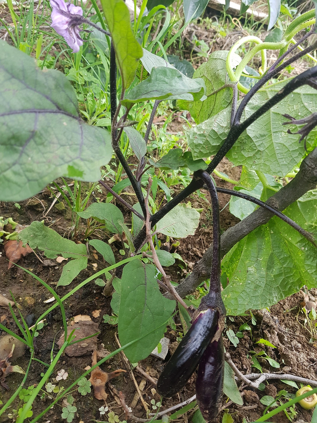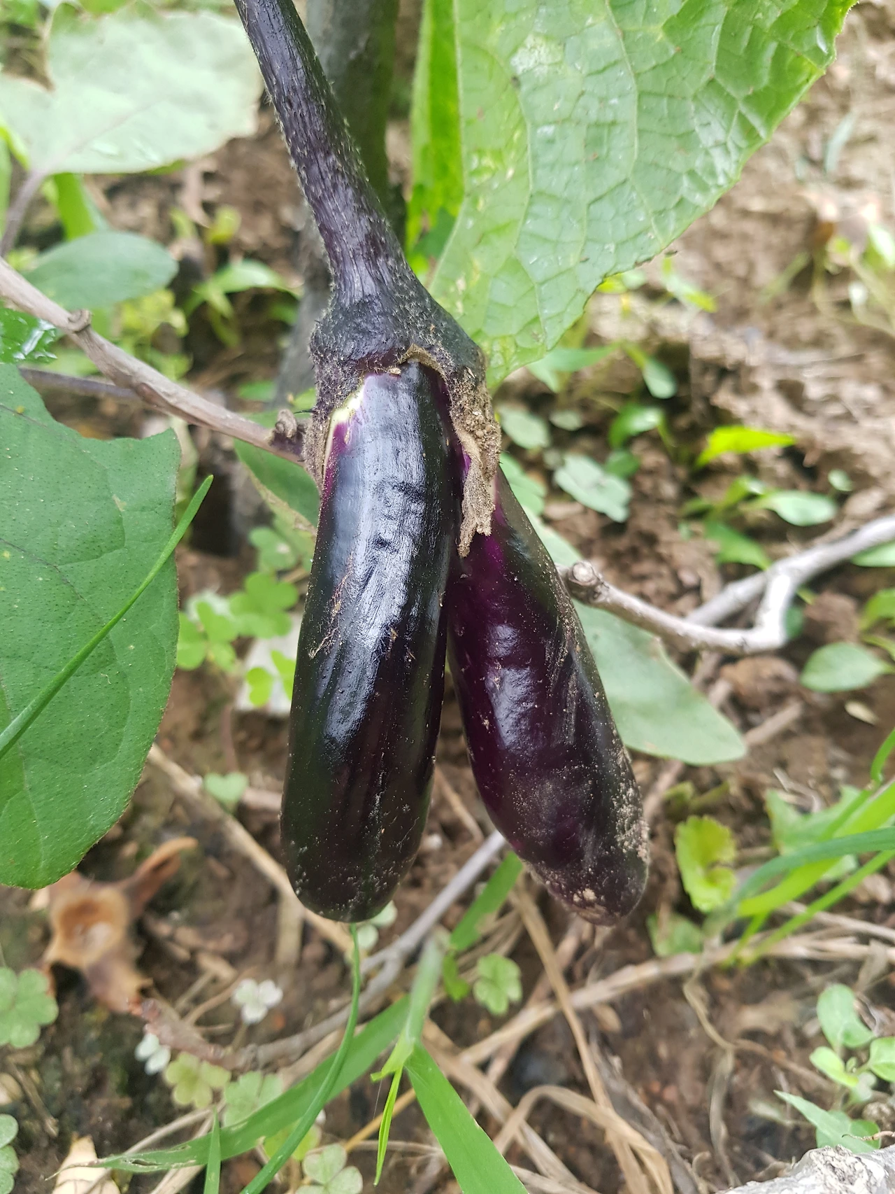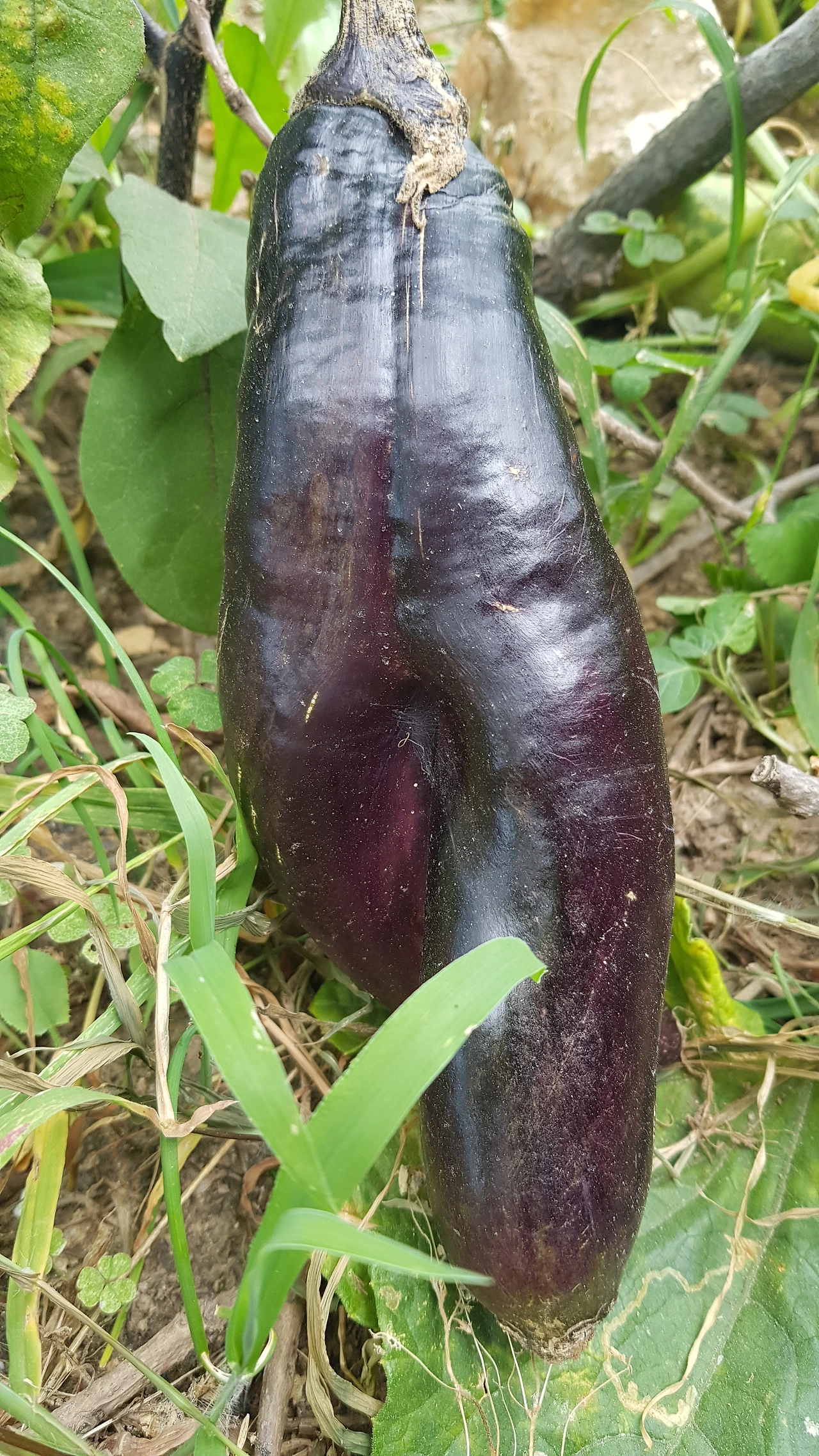 사실 돌연변이 채소를 텃밭에서 처음 본 것은 이번만이 아니다. 시골 친구에게 얻어온 가지 모종을 부추밭에 심었는데, 몇 주 전에 열매가 열렸다. 지난주에 내려와 자라기 시작한 가지 생김새를 보며 뭔가 이상한 느낌이 들었다. 가지가 걷는 모양처럼 생겼기 때문이다. 머리는 하나이지만 몸과 다리가 두 개였다.