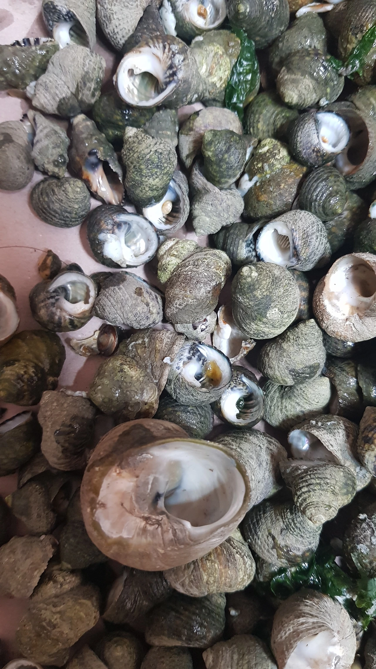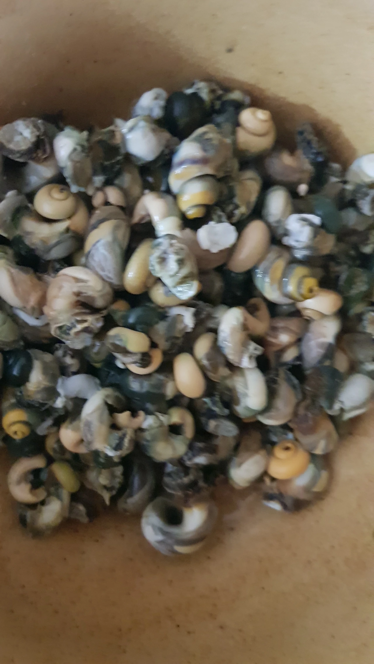 바늘로 고동을 깔 수 있는 것보다 고동을 깔 수 없는 것이 더 많았다. 지친 우리는 고동을 깨서 고동 살을 빼내는 방법을 택하기로 했다. 작은 돌을 가지고 와 고동을 올려놓고 펜치로 살살 두드려 고동을 깨기 시작했다. 어떻게든 고동 살을 건져내 보려는 것이다. 어느 정도 두들겨 고동 살을 빼고 물에 씻어 보았다. 그런데 씻은 고동에 여전히 으깨진 고동 껍질 부스러기가 남아있었다. 먹을 수가 없었다. 앝타깝지만 닭 먹이로 줄 수밖에 없었다.