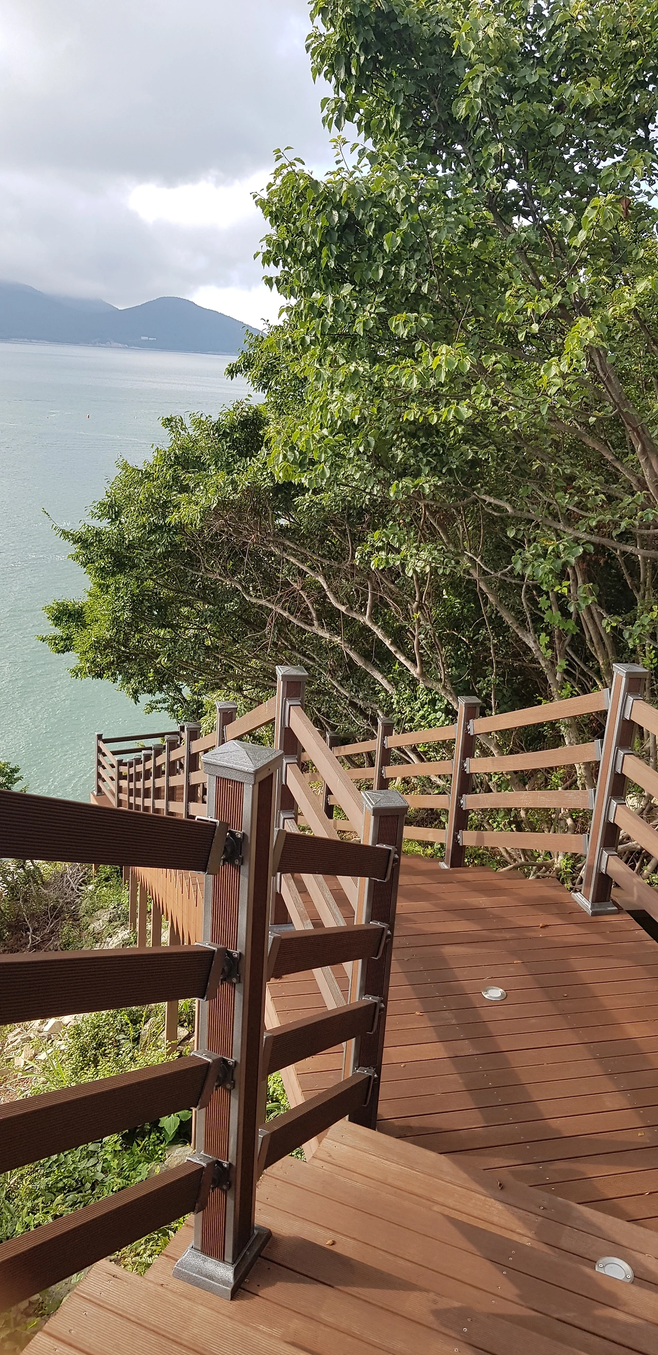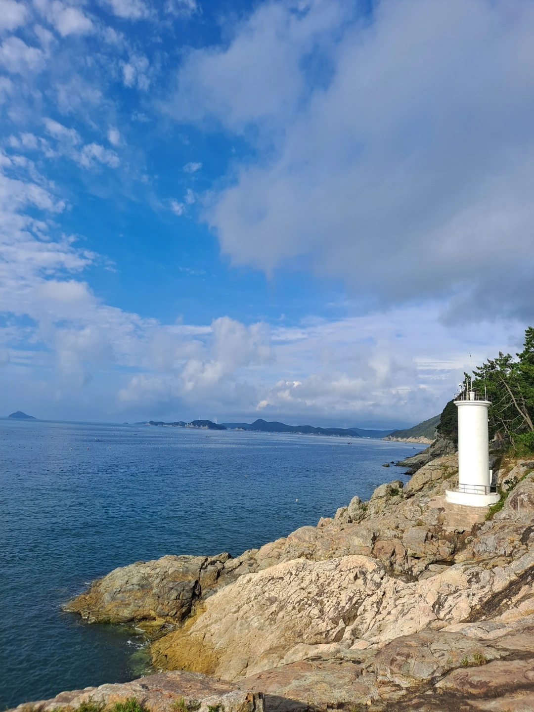 동백나무숲길을 끝에는 바다로 내려가는 데크길을 만들어 놓았다. 계단을 걸어 내려가 바다 위 절벽 제일 위까지 갈 수 있다. 그 끝이 이곳을 좀 와봤던 라테는 과거 초소 비슷한 곳이 있던 곳이라고 알려 주었다. 멀리 하얀 등대가 바위 위에서 굳건히 섬을 지키고 있었다.