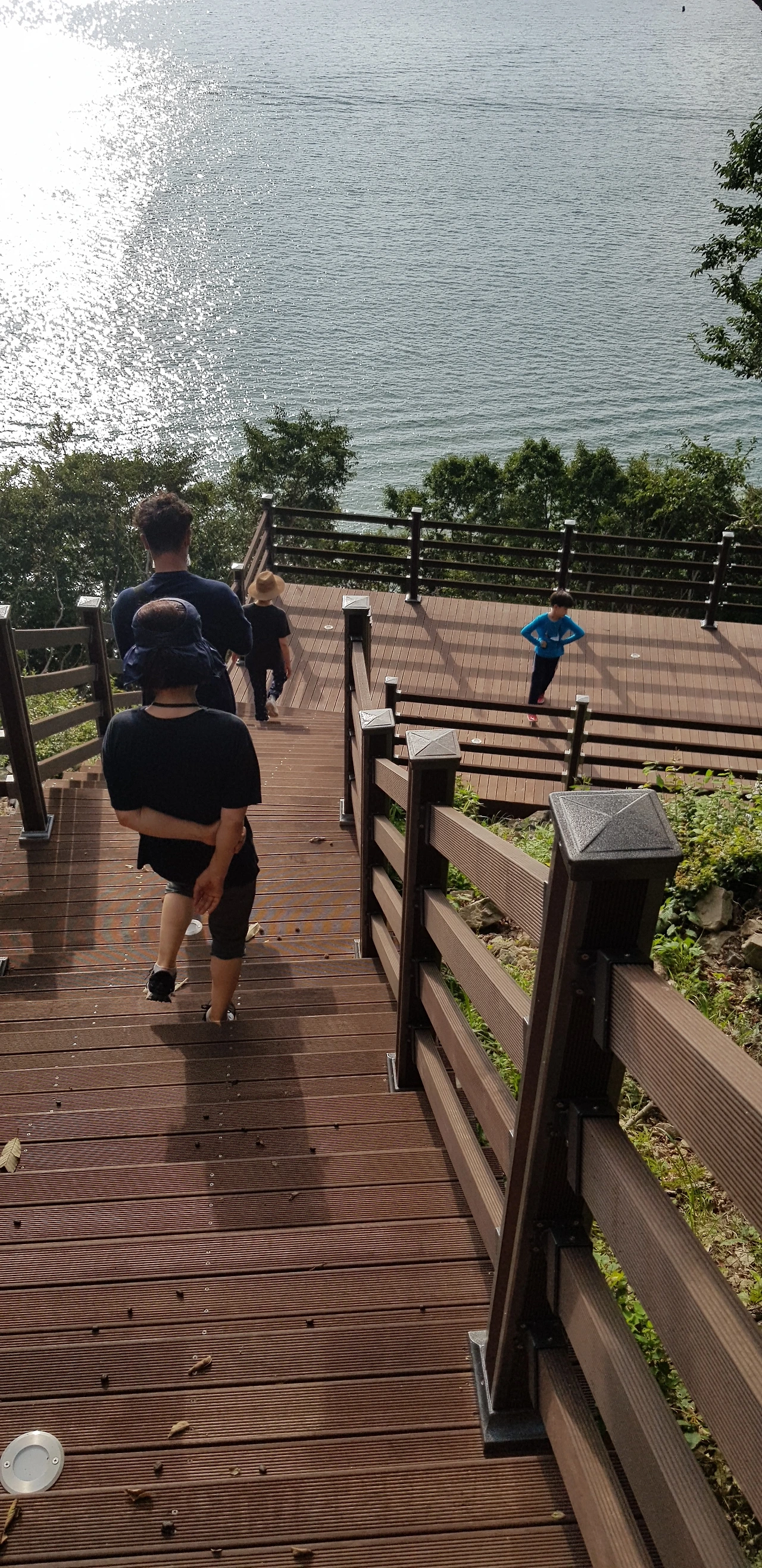 아이는 절벽 아래로 내려가는 데크길에서 만난 바다를 바라보며 펼쳐진 절경에 탄성을 질렀다. 그러나 올라오는 계단길이 힘들어서 인지 투정을 부렸다. 친구 같은 아버지는 그 아들을 넓은 팔에 안아 들고 계단 올라왔다. 온몸에 땀이 홍건 했지만 아들을 사랑하는 아버지의 진한 애정의 땀이었을 것이다.