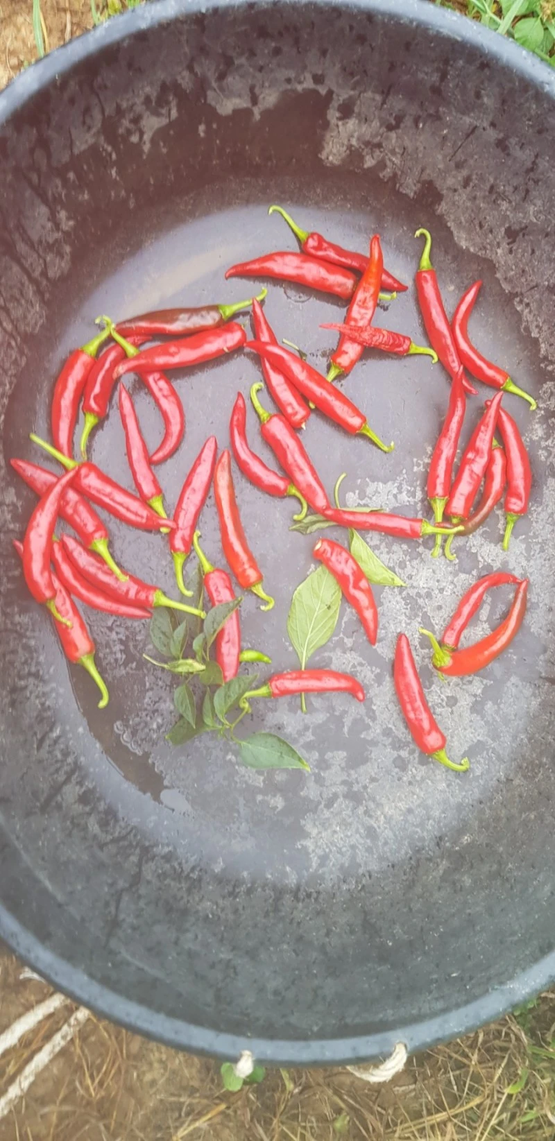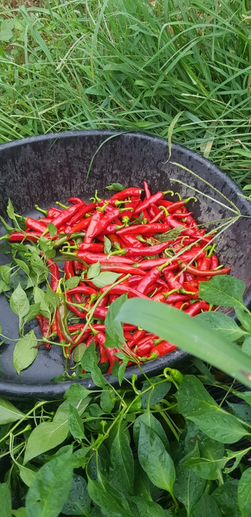 고추를 바구니에 담아 끌고 집으로 돌아왔다. 고추를 보니 파란 고추며 아직 붉게 익지 않은 고추까지 따왔다.