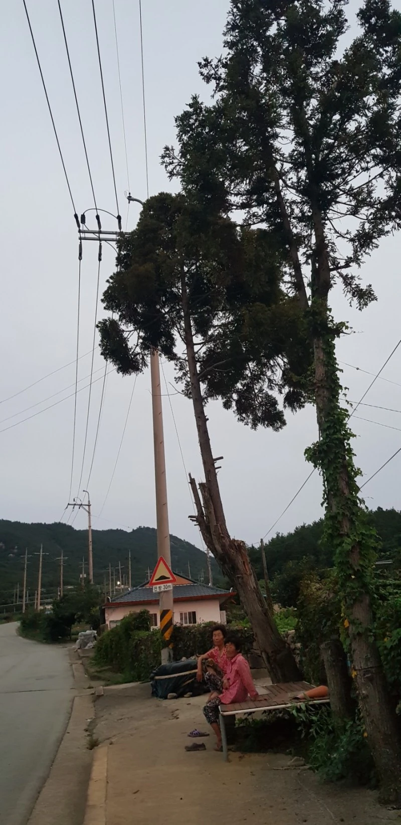 윗길로 올라가려는데 어르신 두 분이 나무 아래 평상에 앉아계셨다. 지난해만 해도 세 그루의 나무였는데 올해 한그루는 베어지고 두 그루만 남았다. 이넓은 마을에 나이 든 어르신 단둘이라니 적막함만 흐른다.