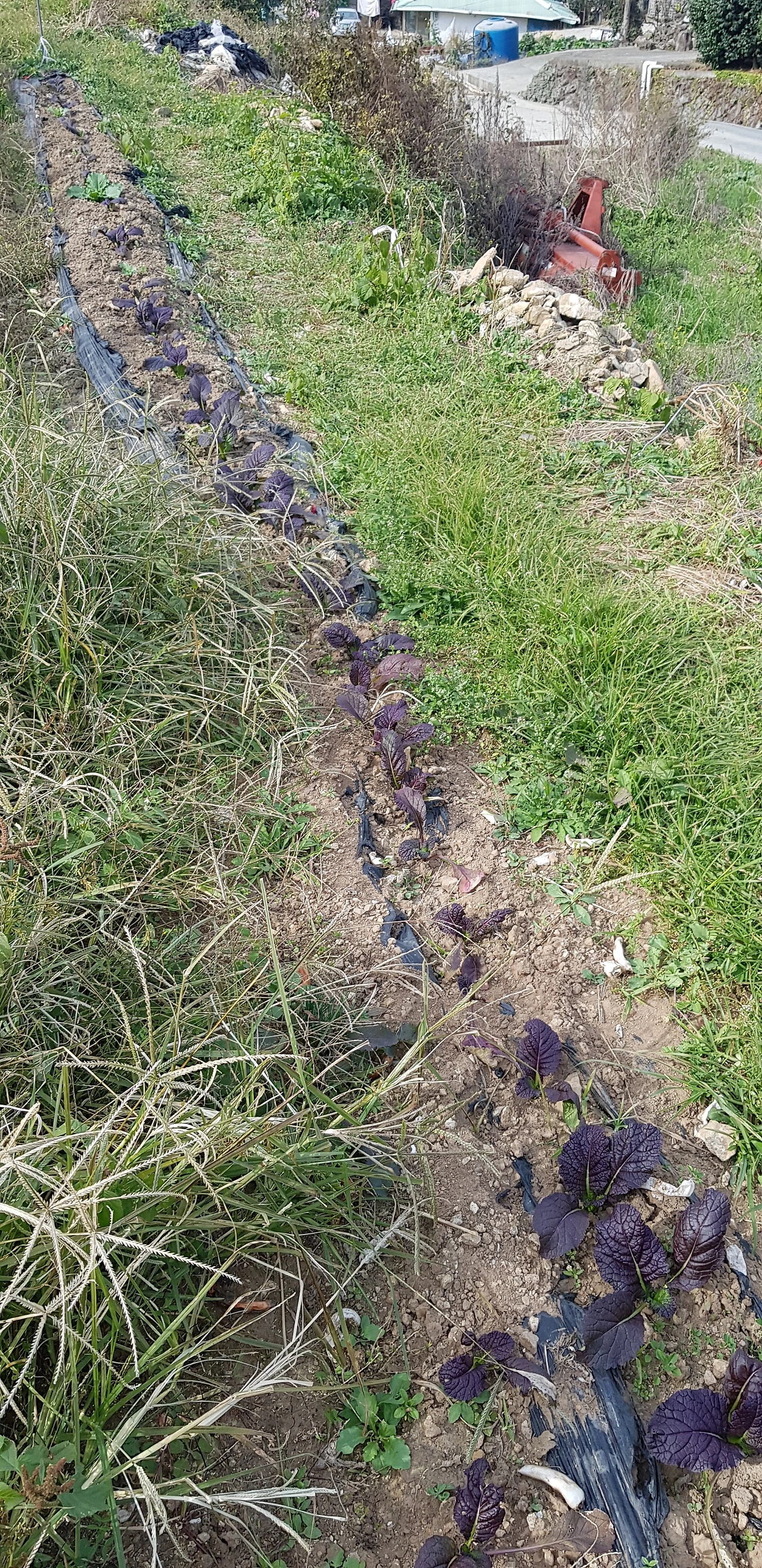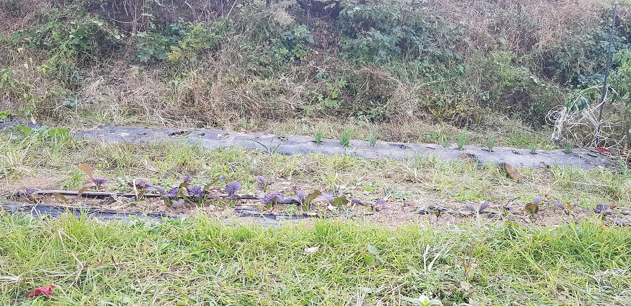 고춧대를 뽑은 고랑에 쪽파 모종을 심었고 다른 고랑에는 배추 모종을 심었다. 배추 모종은 처음부터 상태가 좋지 않아서인지 그대로 죽어버렸다. 그곳에 갓 모종을 대신 심었더니 잘 살아나고 있었다. 그런데 그 중간 고랑 사이에 풀이 지천이다. 그것을 풀을 메기 싫다는 이유로 아직까지 외면한 것이다.