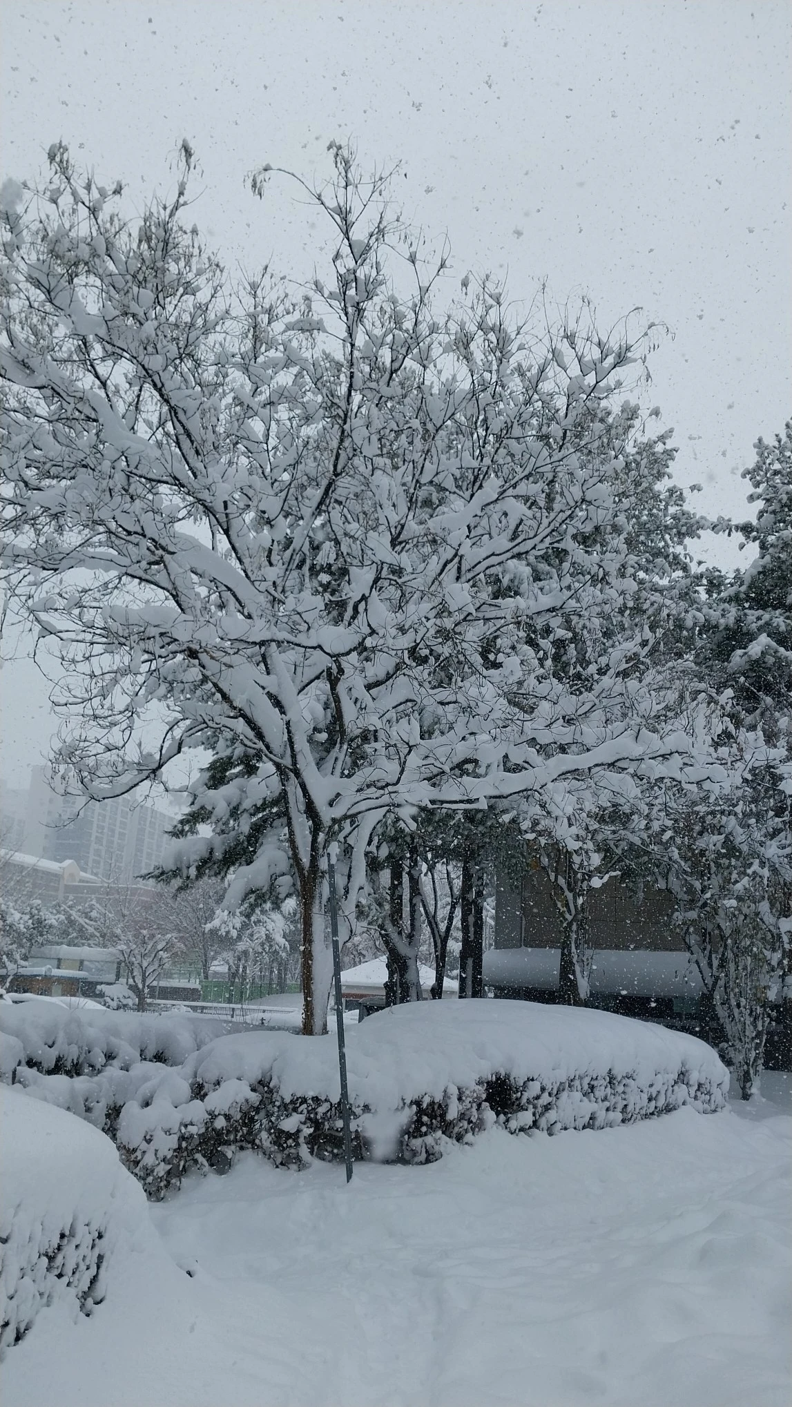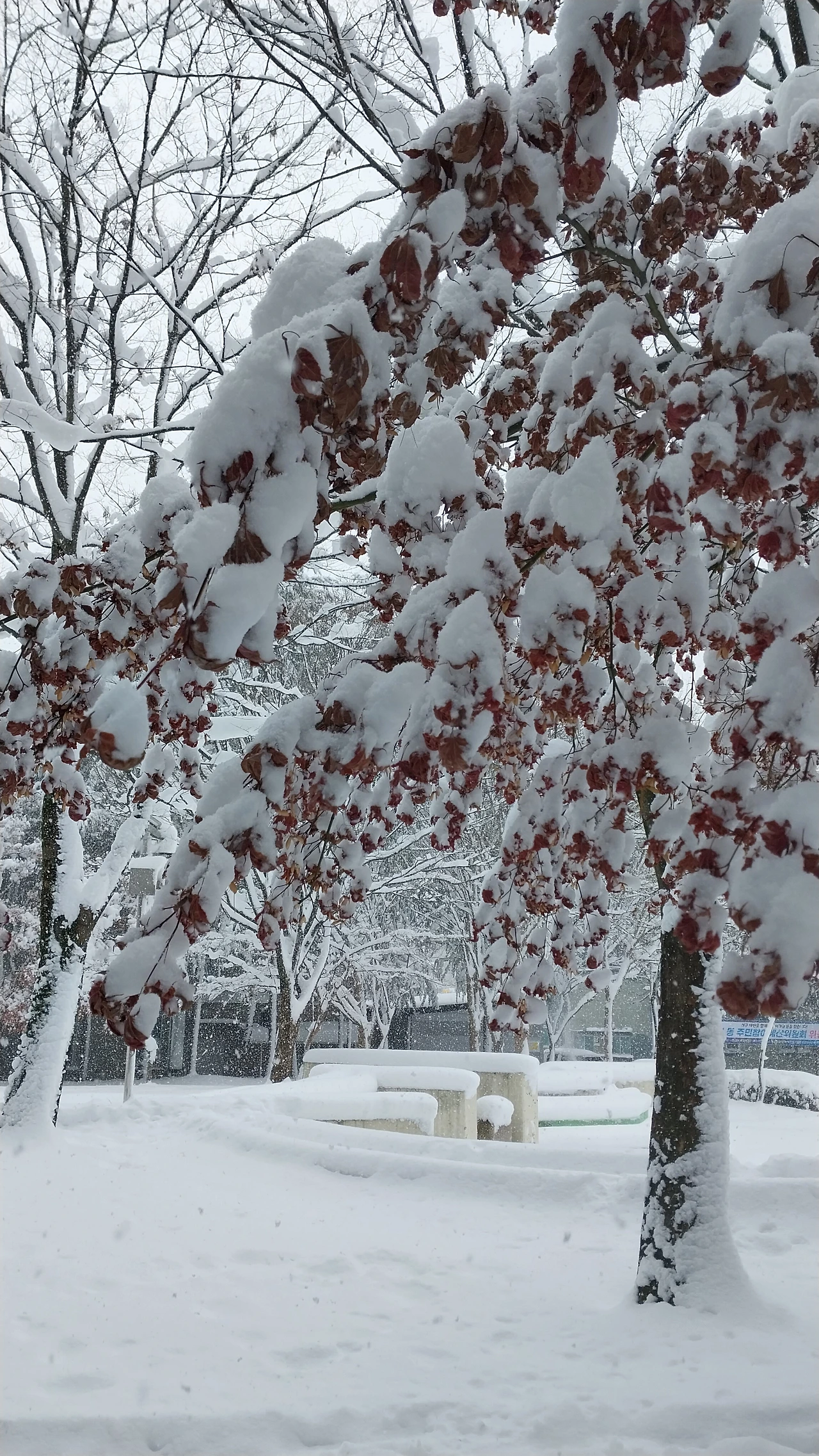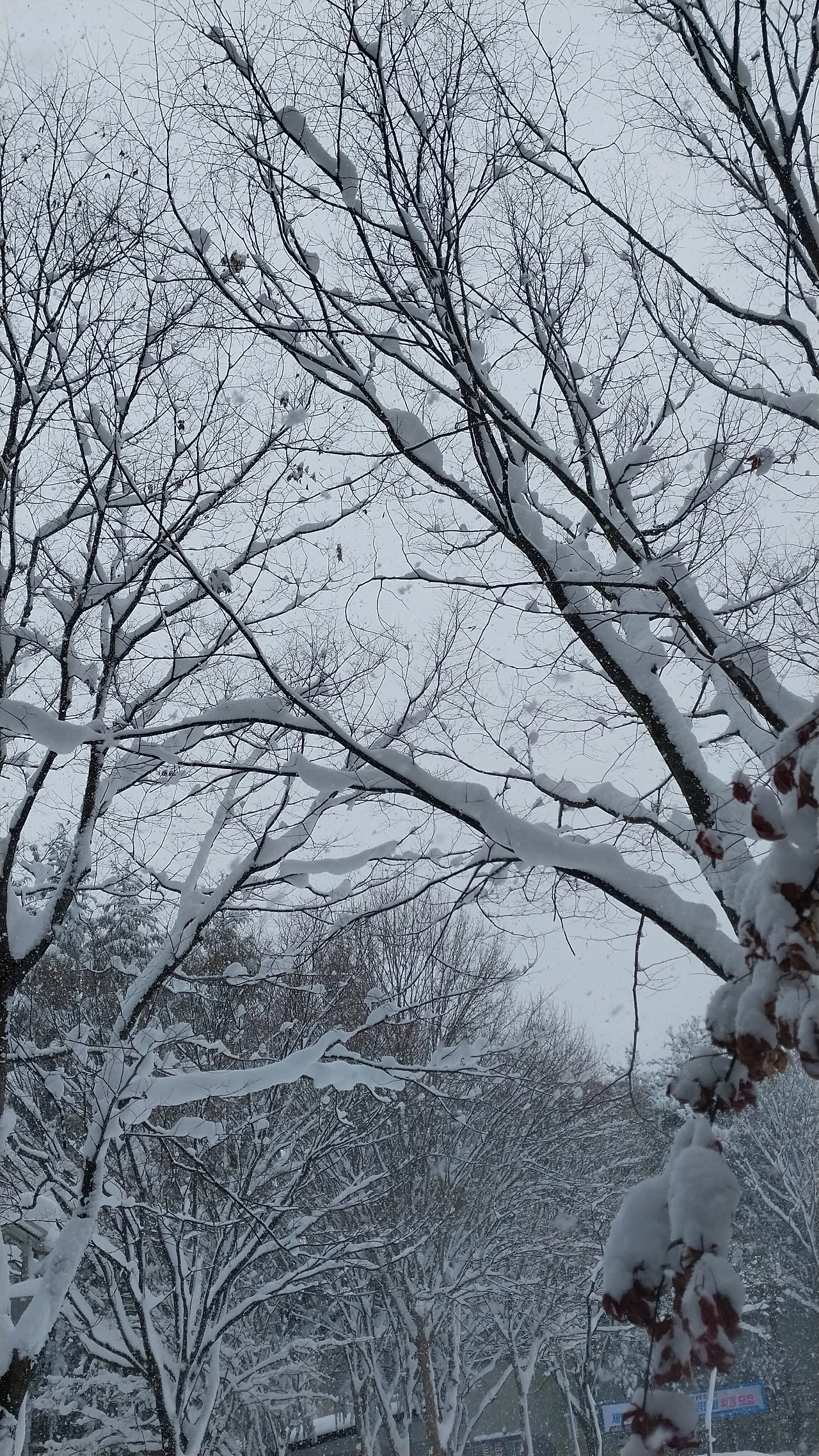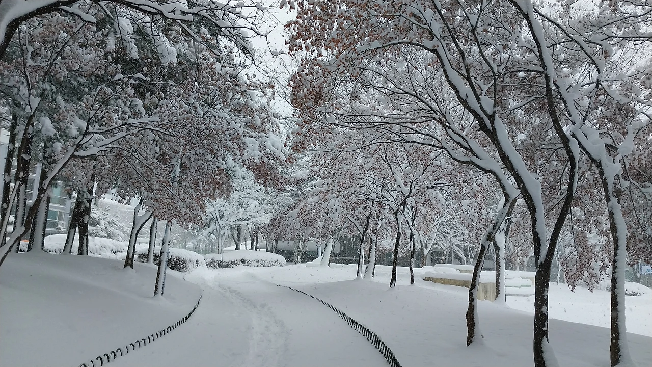 좁은 눈길을 걸어가며 눈이 쌓인 곳과의 높이 차이를 보니 대충 종아리 까지 빠질 만큼 눈이 쌓였다. 눈을 치우시는 분들의 제설작업이 따라가지 못할 만큼 계속 내리고 있다. 아파트 앞에는 염화칼슘을 뿌려 눈이 녹고 있지만 다시 내린 눈에 길이 미끄러워 넘어질뻔했다. 흰 눈이 소복이 쌓인 길을 밟고 걸어가는 것이 차라리 미끄러지지 않고 안전하다. 눈길에 자동차 사고도 많이 나고 있는 날이다.