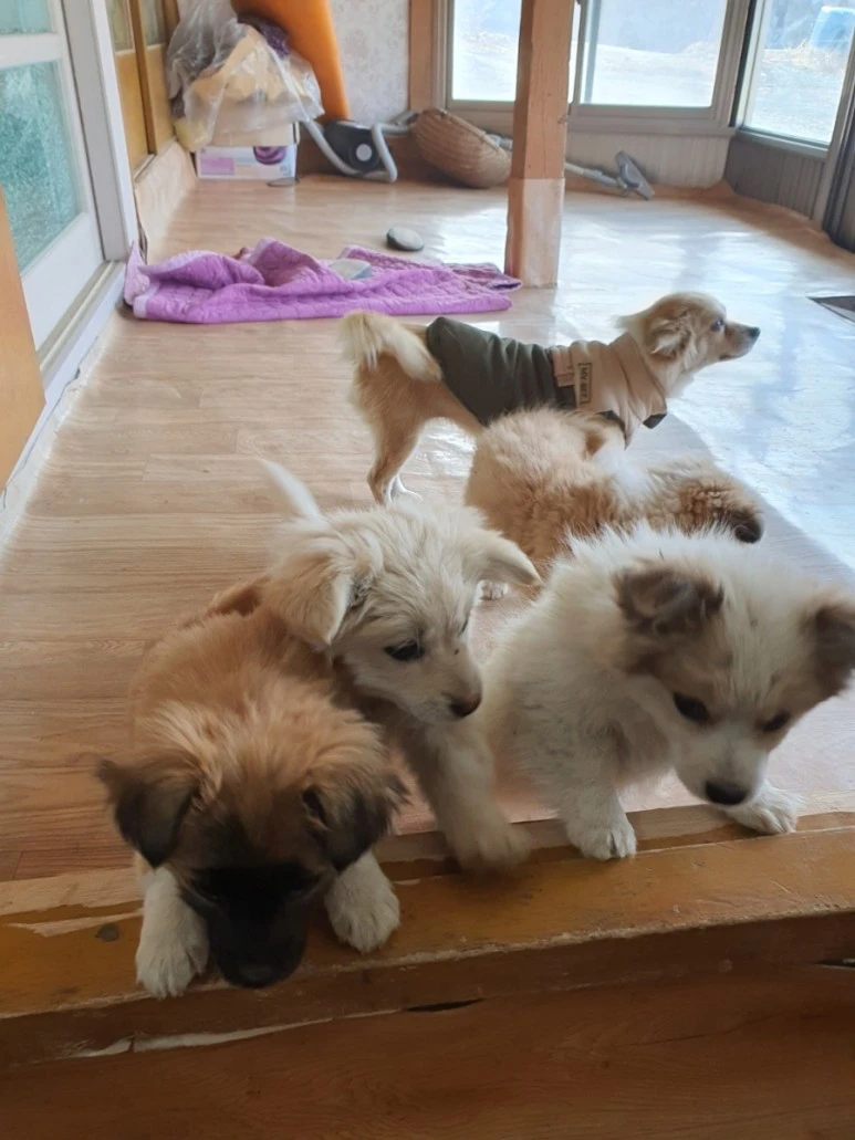 자동차가 시골집 마당으로 들어서자 마당에서는 마루가 꼬리를 흔들며 반겨주었다. 새끼강아지들은 어디있나 찾아보았다. 강아지 집은 추위를 피해 재래식 변소가 있는 창고 안에 딱하니 자리 잡고 있었다. 낯선 사람들이 많이 와서인지 강아지들이 집에서 나오지 않았다. 엄마 마루가 다가오자 강아지들이 집에서 마당으로 따라왔다. 마루 주위로 4마리 털복실이 새끼 강아지들이 반길 듯 도망갈듯하며 꼬리를 쳐댔다. 다섯 마리가 옹기종기 사람의 손길이 무서워 발발 떨던 모습이 눈에 선한데 이제 한 마리는 이미 어느 집으로 입양을 갔는지 4마리와 엄마 마루가 집을 지키고 있다. 못 본 사이 아기 티를 벗어던지고 초등학생 정도의 강아지로 성장해있었다.