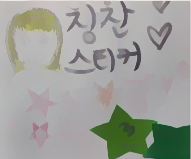 종이 한 장을 가져와 칭찬 스티커라고 크게 썼다. 자신의 이름이 붙은 칭찬 스티커판을 벽에 붙여 놓으니 아이는 이곳에 어떻게 별표가 붙여질까 관심을 가졌다. 당장 아이는 별표를 어떻게 붙일 거냐며 물어왔다. 일단 볼펜으로 별표를 그려 주겠다고 하고 별표를 오려 풀로 붙일 수도 있는 방법을 알려 주었다.