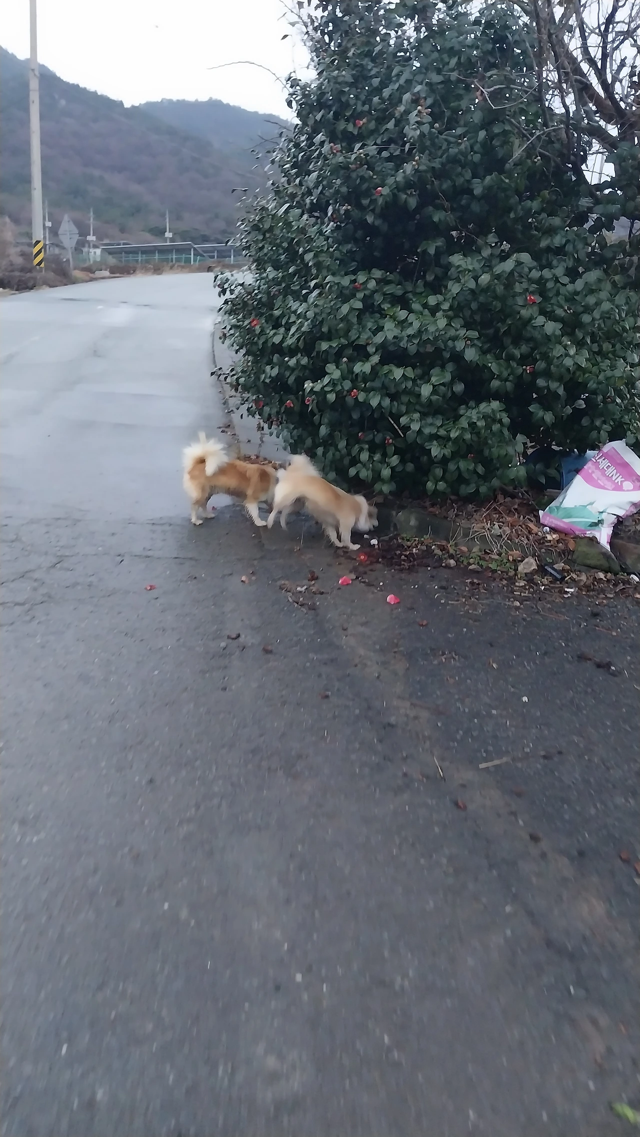 목줄이 풀린 기념으로 마실을 나간 두 녀석이 잠시후 돌아왔다. 그사이 막내는 가져온고기를 먼저 얻어먹고 있었다. 이름을 부르자 두 녀석은 꼬리를 흔들어대며 나에게 반가움을 표시했다. 그리고 내가 주는 고기를 야금야금받아먹었다. 먹을 것이 다 떨어진 것을 알자 다시 두 녀석의 달음박질이 시작됐다. 달음박질이라고 하지만 동네 마실을 다니며 영역표시를 해야 하기 때문에 바쁜 것 같다. 못만난 친구들에게 안부를 전하고서야 한참만에 다시 집으로 돌아왔다.